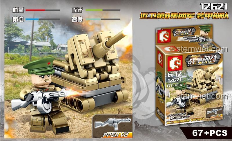 Mẹ hãy cùng bé chiêm ngưỡng sự tỉ mỉ trong từng chi tiết của đồ chơi lắp ráp Sembo 12621 nhé! Chú lính Hồng quân tí hon được trang bị bộ quân phục màu xanh lá đặc trưng, đội chiếc mũ ca lô nghiêm trang, gương mặt thể hiện sự kiên định. Trong tay chú là khẩu súng tiểu liên PPSh-41 huyền thoại, một biểu tượng của Hồng quân thời bấy giờ. Điểm nhấn chính là khẩu pháo tự hành mini, dù nhỏ bé nhưng vẫn toát lên vẻ mạnh mẽ với tông màu nâu sa mạc và xám kim loại. Nòng pháo có thể nâng lên hạ xuống, bệ pháo có thể xoay, cho phép bé thỏa sức sáng tạo các tình huống chiến đấu. Tất cả 67 mảnh ghép đều được thiết kế với độ chính xác cao, tạo nên một tổng thể hài hòa, cứng cáp. Kích thước nhỏ gọn của bộ mô hình này rất phù hợp để trưng bày trên bàn học của bé, như một lời nhắc nhở về những câu chuyện lịch sử và là nguồn cảm hứng cho những trò chơi sáng tạo.