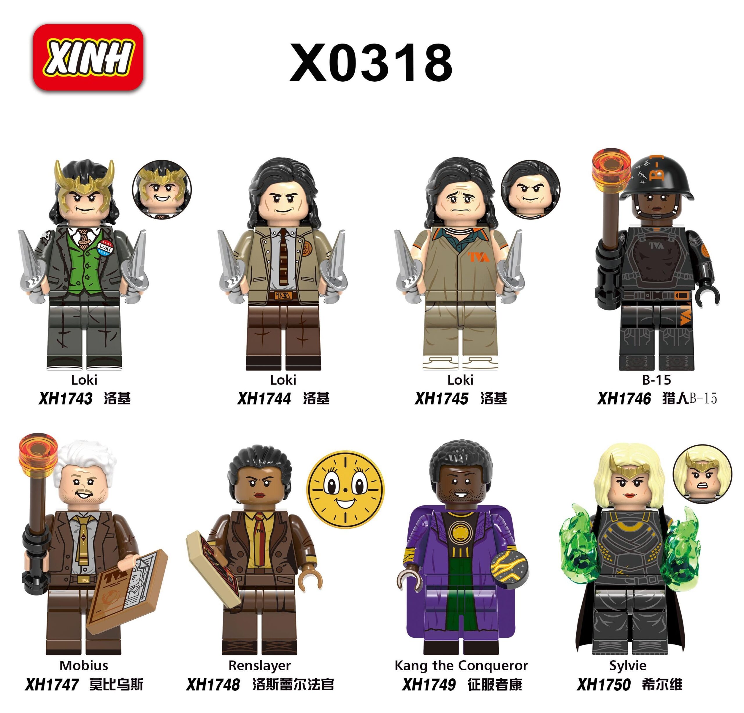 Bộ sản phẩm XINH X0318 bao gồm trọn bộ 8 nhân vật từ series phim Loki, gồm: 3 phiên bản Loki (Tổng thống, đồng phục TVA, áo khoác TVA), Sylvie, Mobius, Thợ săn B-15, Thẩm phán Renslayer và Kang Kẻ Chinh Phạt.