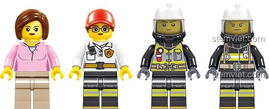 Bộ sản phẩm bao gồm 4 nhân vật (minifigures) gồm 3 lính cứu hỏa và 1 thường dân, cùng các phụ kiện đi kèm như bình chữa cháy, rìu, các chi tiết ngọn lửa… để bé thỏa sức sáng tạo câu chuyện.
