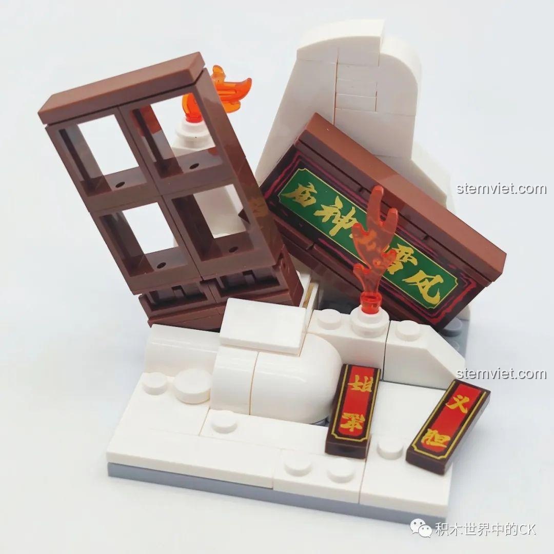 Không chỉ có nhân vật, đế trưng bày đi kèm cũng là một điểm nhấn độc đáo của set đồ chơi 10801 này. Đế được thiết kế mô phỏng khung cảnh tuyết rơi tại miếu Sơn Thần, nơi Lâm Xung đã viết nên một trong những trang bi tráng nhất cuộc đời mình. Các chi tiết như cửa sổ gỗ đổ nát, ngọn lửa bập bùng và những tấm biển chữ Hán cổ kính đều được tái hiện một cách tinh xảo, tạo nên một bối cảnh hoàn hảo để trưng bày mô hình Lâm Xung Decool 10801.