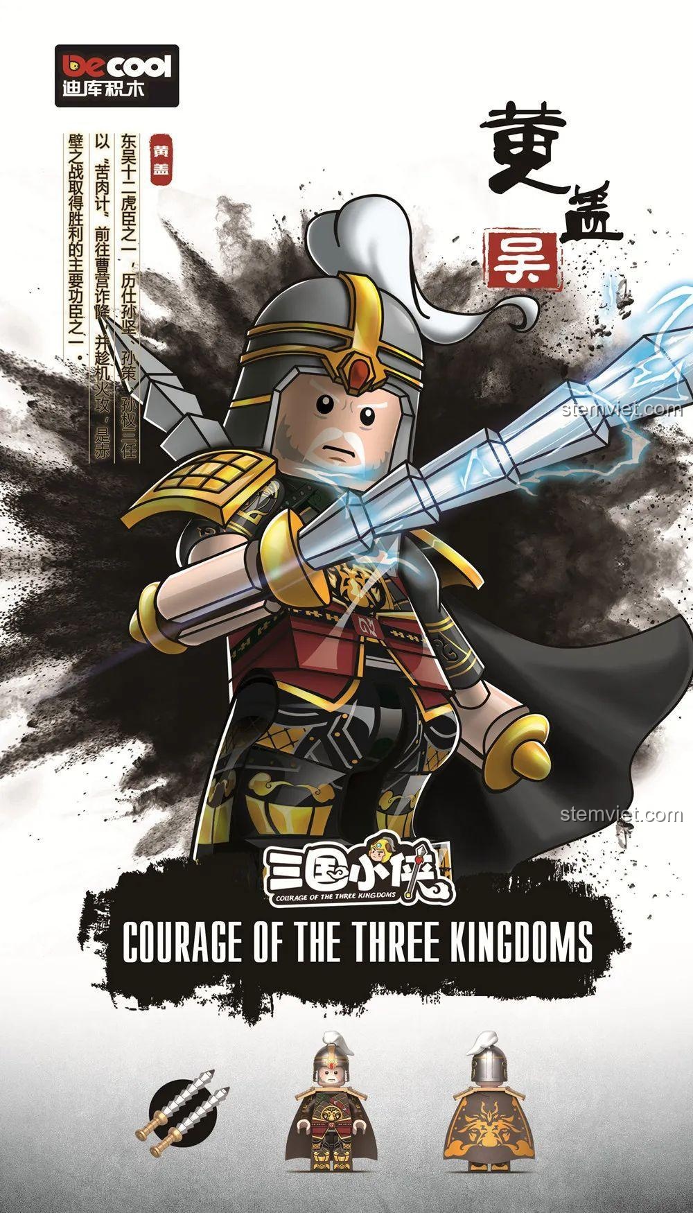 Bộ đồ chơi DECOOL 20325 bao gồm 6 minifigure độc đáo, tái hiện các nhân vật nổi tiếng trong Tam Quốc Diễn Nghĩa. Đó là Hoàng Cái, Khương Duy, Lỗ Túc, Lục Tốn, Ngụy Diên và Tào Phi. Mỗi nhân vật đều có thiết kế riêng biệt và phụ kiện đi kèm, giúp bé dễ dàng nhận diện và nhập vai vào các tướng lĩnh Tam Quốc yêu thích.