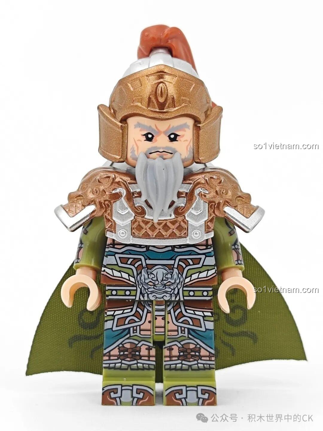Ngay từ cái nhìn đầu tiên, mẹ và bé sẽ bị ấn tượng bởi sự đầu tư tỉ mỉ vào thiết kế của minifigure Decool 20377. Từng chi tiết trên bộ giáp trụ màu xanh lá và vàng đồng đều được in sắc nét, tái hiện hoa văn phức tạp của chiến giáp xưa. Chiếc mũ trụ kiên cố, bộ râu bạc trắng phơ và ánh mắt cương nghị đã lột tả thành công thần thái của một vị lão tướng dày dạn sương gió. Đặc biệt, bộ giáp vai hình đầu rồng và áo choàng vải phía sau càng làm tăng thêm vẻ uy nghi. Điểm nhấn không thể bỏ qua là thanh Mâu Sắt Rắn (Thiết Tích Xà Mâu) trứ danh, vũ khí đã cùng Trình Phổ lập nên bao chiến công. Mọi chi tiết đều được chăm chút để mang lại một mô hình chân thực, sống động, xứng đáng có mặt trong bộ sưu tập của bất kỳ fan hâm mộ Tam Quốc nào.