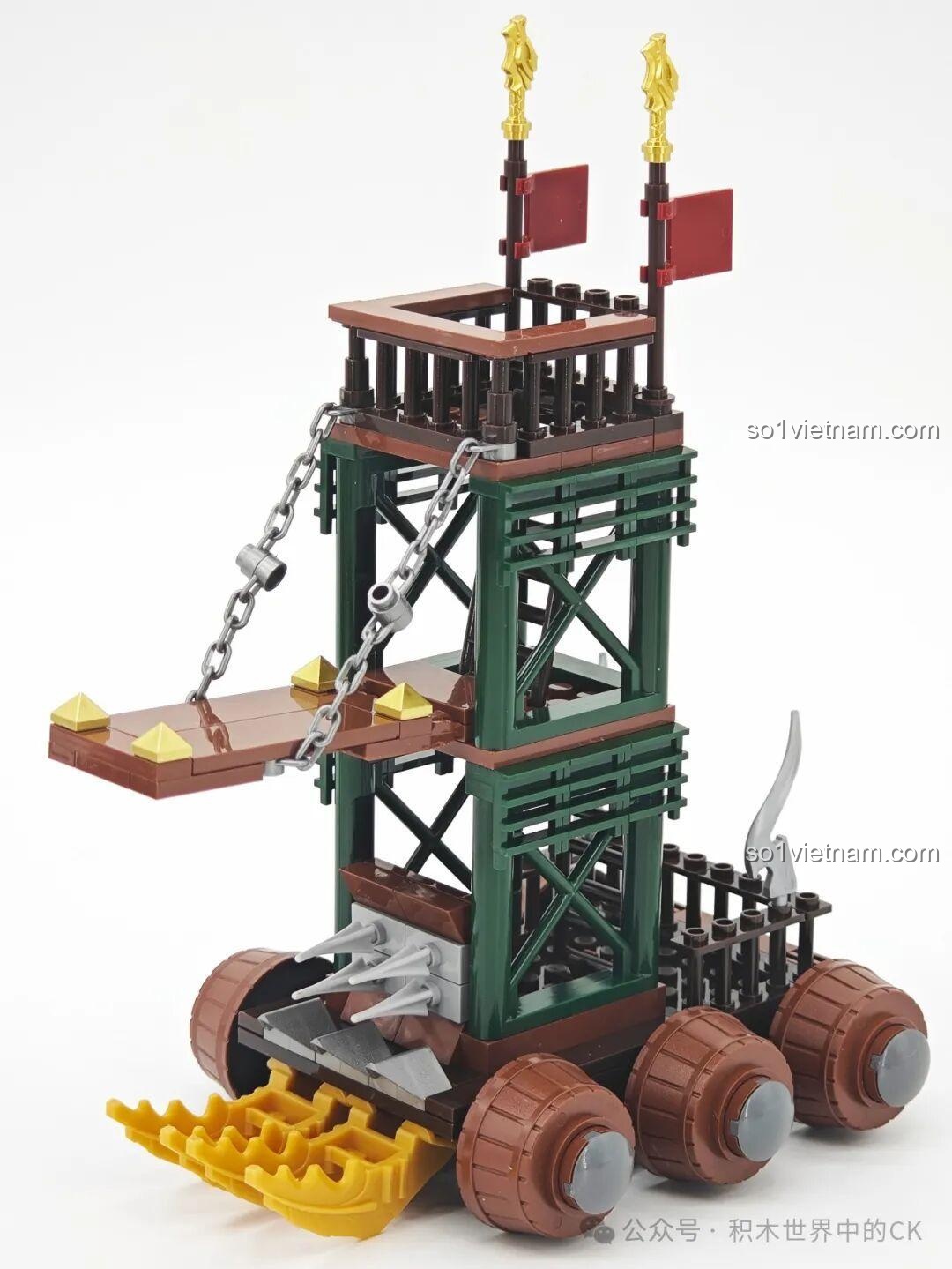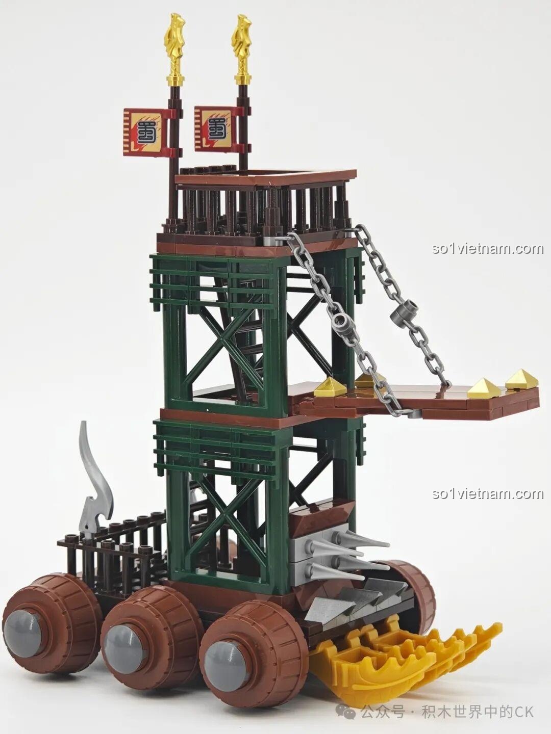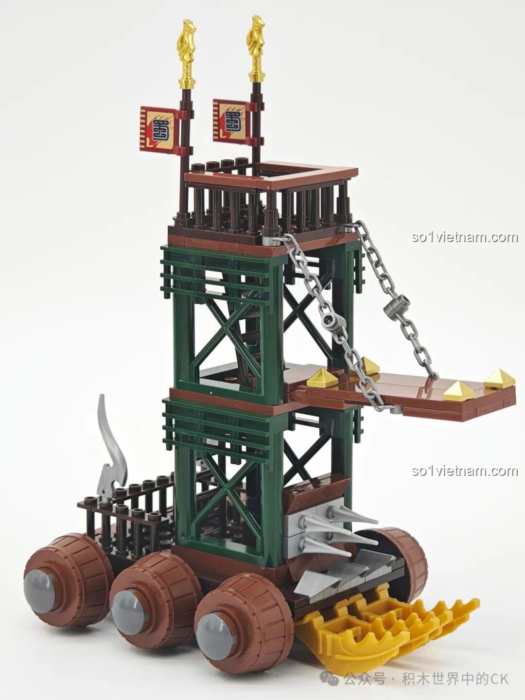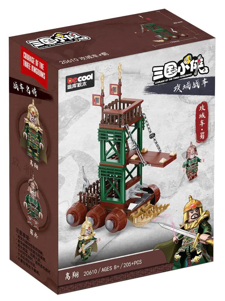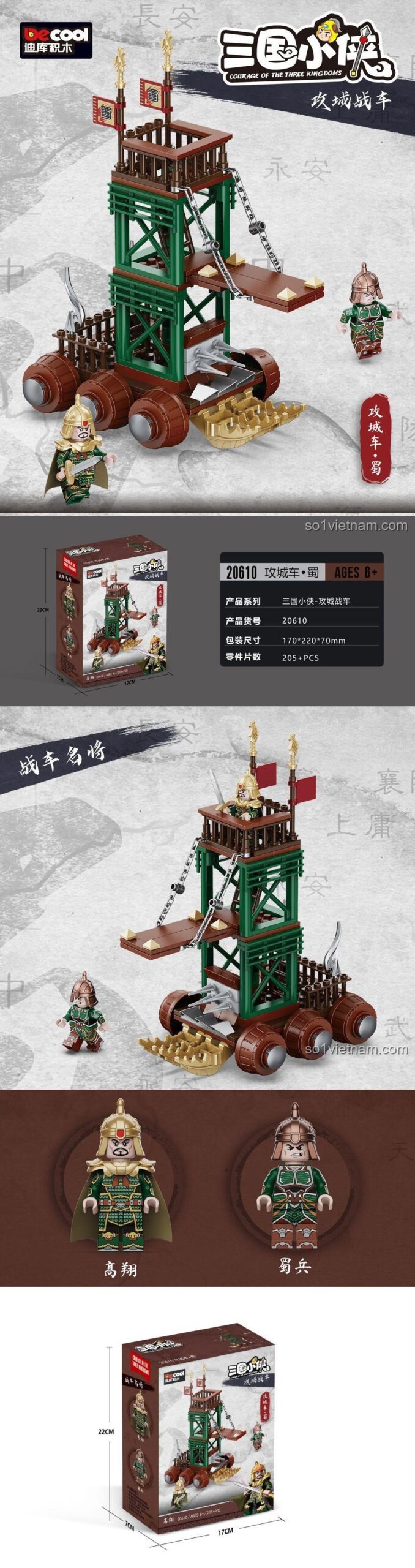 Bộ lắp ghép Decool 20610 nổi bật với thiết kế mô phỏng chân thực Xe Bánh Xích Công Thành, một vũ khí lợi hại trong các cuộc vây hãm thời Tam Quốc. Từng chi tiết nhỏ như bánh xe, tháp pháo, thang leo, cờ hiệu đều được tái hiện tỉ mỉ, mang đến một mô hình sống động và đầy ấn tượng.