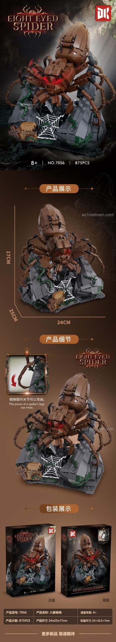Ngay từ cái nhìn đầu tiên, mô hình Nhện Tám Mắt DK 7056 sẽ khiến bất kỳ cậu bé nào cũng phải trầm trồ. Với kích thước ấn tượng 24 x 25 x 17 cm sau khi hoàn thành, nó thực sự là một con quái vật trên bàn học hay kệ trưng bày. Từng chi tiết được chăm chút tỉ mỉ, từ 8 con mắt đỏ ngầu đầy đe dọa, cặp nanh sắc nhọn, cho đến phần thân và bụng được tạo hình gồ ghề, phủ một màu nâu sẫm đầy bí ẩn. Đặc biệt, các chân nhện được thiết kế với nhiều khớp nối, tạo cảm giác ‘lông lá’ và gân guốc như thật. Mô hình được đặt trên một đế địa hình vững chắc, mô phỏng một góc rừng âm u với đá tảng, rêu xanh và mạng nhện giăng khắp nơi, tăng thêm phần sống động và chân thực cho câu chuyện của bé. Đây thực sự là một tác phẩm nghệ thuật chi tiết, một thành quả đáng tự hào sau những giờ phút lắp ráp tập trung.
