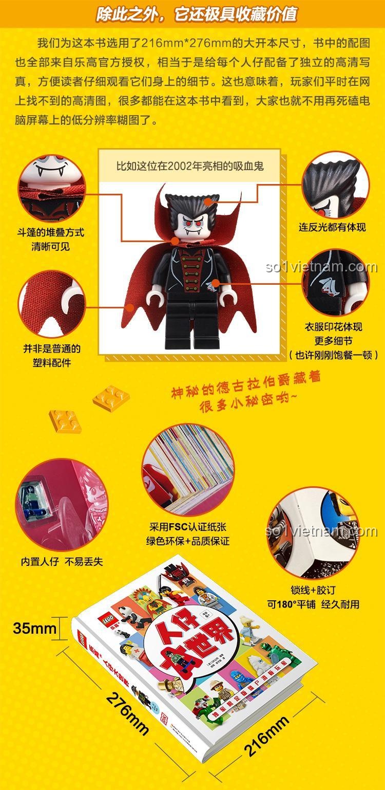 Kích thước của cuốn Đồ chơi mô hình LEGO Minifigure này cũng rất ấn tượng: chiều dài 27.6 cm, chiều rộng 21.6 cm và chiều cao 3.5 cm, tương đương với một cuốn bách khoa toàn thư mini. Điều này không chỉ giúp việc đọc và tra cứu trở nên dễ dàng mà còn tạo cảm giác cầm nắm chắc chắn, cao cấp. Mỗi minifigure được giới thiệu đều có hình ảnh lớn, rõ nét, kèm theo các chú thích chi tiết về năm phát hành, độ hiếm, và những câu chuyện thú vị đằng sau thiết kế của chúng. Đây là cơ hội tuyệt vời để bé và cả gia đình cùng nhau khám phá vẻ đẹp tinh xảo và sự sáng tạo không giới hạn trong từng nhân vật LEGO®.