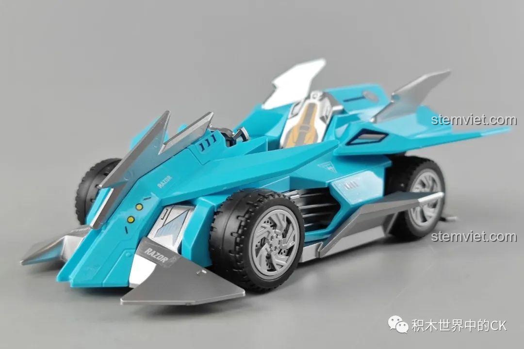 Ngay từ cái nhìn đầu tiên, set đồ chơi Xe Đua Tốc Độ Razor đã gây ấn tượng mạnh với thiết kế khí động học cực kỳ hiện đại và mạnh mẽ. Màu xanh dương chủ đạo kết hợp với các chi tiết xám bạc tạo nên một tổng thể hài hòa, toát lên vẻ đẹp của một cỗ máy tốc độ thực thụ. Từng đường nét, góc cạnh của chiếc xe đều được chăm chút tỉ mỉ, tái hiện chân thực hình ảnh xe Razor trong game QQ Phi Xa.