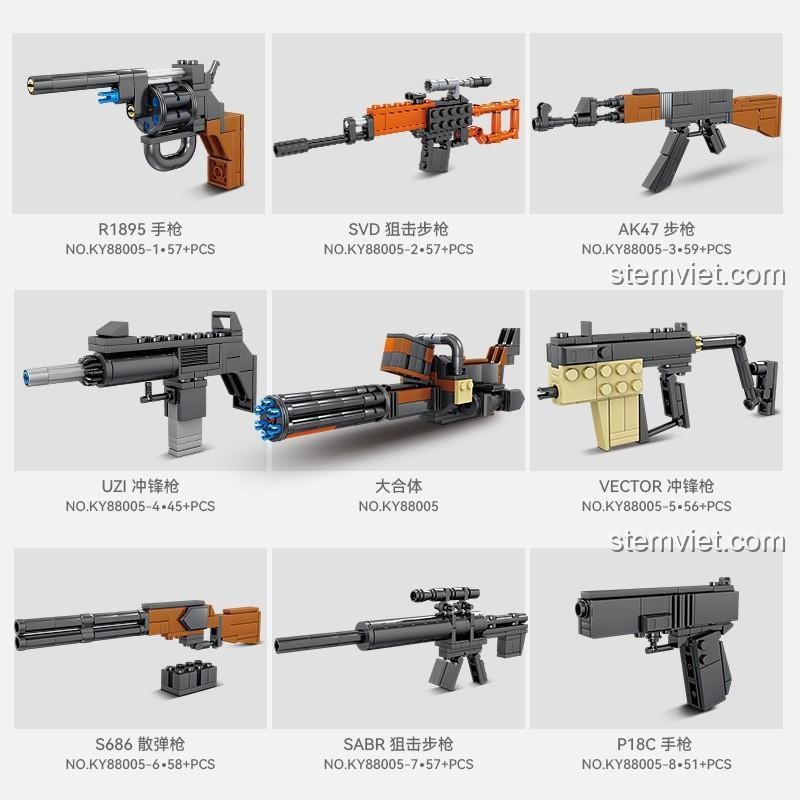 Bộ đồ chơi KAZI KY88005 này có thể lắp được bao nhiêu kiểu súng?