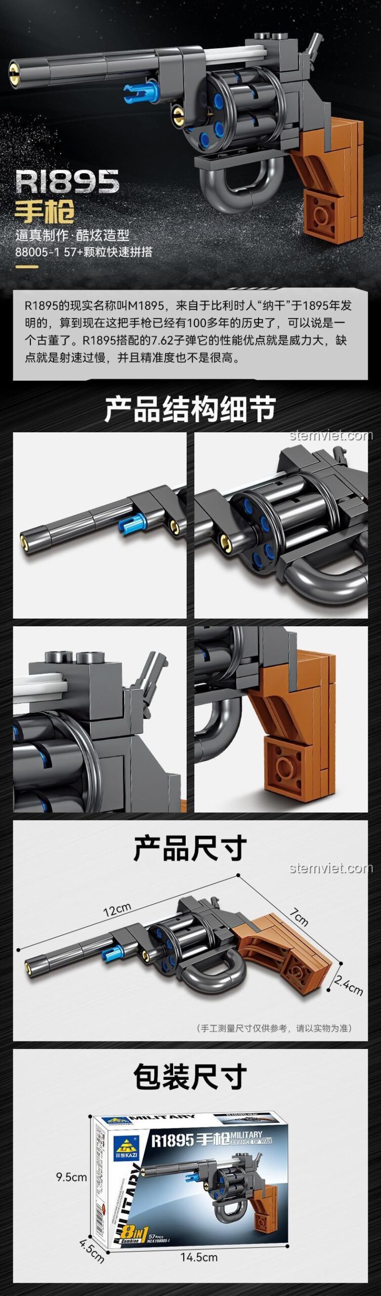 Điểm nổi bật của bộ đồ chơi lắp ráp KAZI KY88005 chính là sự tỉ mỉ trong từng chi tiết thiết kế. Với màu sắc chủ đạo là Đen, Cam và Xám, các mô hình súng quân sự trở nên vô cùng chân thực và mạnh mẽ. Khẩu súng máy Gatling lớn có kích thước ấn tượng 24.2 x 7 x 7.2 cm, mang đến cảm giác cầm nắm chắc chắn và uy lực. Không chỉ có súng máy Gatling, bộ sản phẩm còn cho phép bé lắp ráp 8 kiểu súng nhỏ khác nhau, mỗi loại đều được tái hiện một cách chính xác, từ súng lục R1895, P18C, súng bắn tỉa SVD, SABR, súng trường AK47, súng tiểu liên UZI, VECTOR cho đến súng săn S686. Mỗi mảnh ghép đều được gia công tinh xảo, đảm bảo độ khớp nối hoàn hảo, giúp bé dễ dàng lắp ráp mà không gặp khó khăn. Sự chính xác trong thiết kế không chỉ mang lại trải nghiệm lắp ráp mượt mà mà còn giúp bé trai 6 tuổi hình dung rõ nét hơn về cấu tạo và chức năng của từng loại vũ khí, từ đó khơi gợi niềm đam mê khám phá và học hỏi.