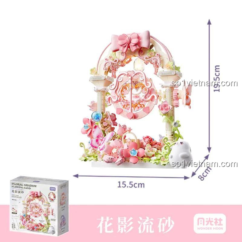 Hãy chuẩn bị choáng ngợp trước vẻ đẹp tinh khôi và lãng mạn của mô hình này. Với kích thước hoàn hảo 15.5 x 8 x 19.5 cm, tác phẩm nghệ thuật này vừa vặn xinh xắn trên mọi không gian, từ bàn học, kệ sách đến bàn trang điểm. Tông màu hồng pastel và trắng kem chủ đạo tạo nên một cảm giác nhẹ nhàng, thư thái. Điểm nhấn là chiếc cổng vòm được trang trí cầu kỳ với những dây leo và nụ hoa chớm nở, hai bên là hai cột trụ vững chãi theo phong cách cổ điển. Trung tâm của sự chú ý chính là khung cát chảy hình tròn, được viền bởi những họa tiết hoa văn tinh xảo. Xung quanh là một vườn hoa rực rỡ và những cánh bướm sống động như thật, tất cả được tạo nên từ những hạt mini block siêu nhỏ, đòi hỏi sự tỉ mỉ và mang lại độ chi tiết đáng kinh ngạc. Đây thực sự là một món đồ trang trí cao cấp, thể hiện gu thẩm mỹ tinh tế của người sở hữu.