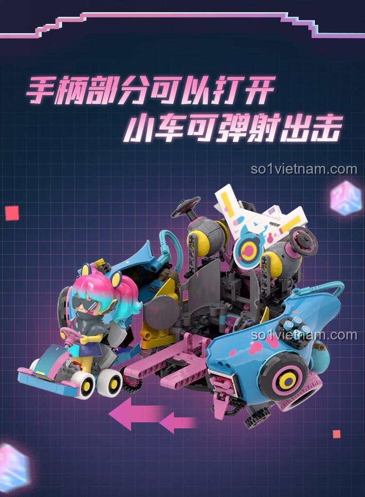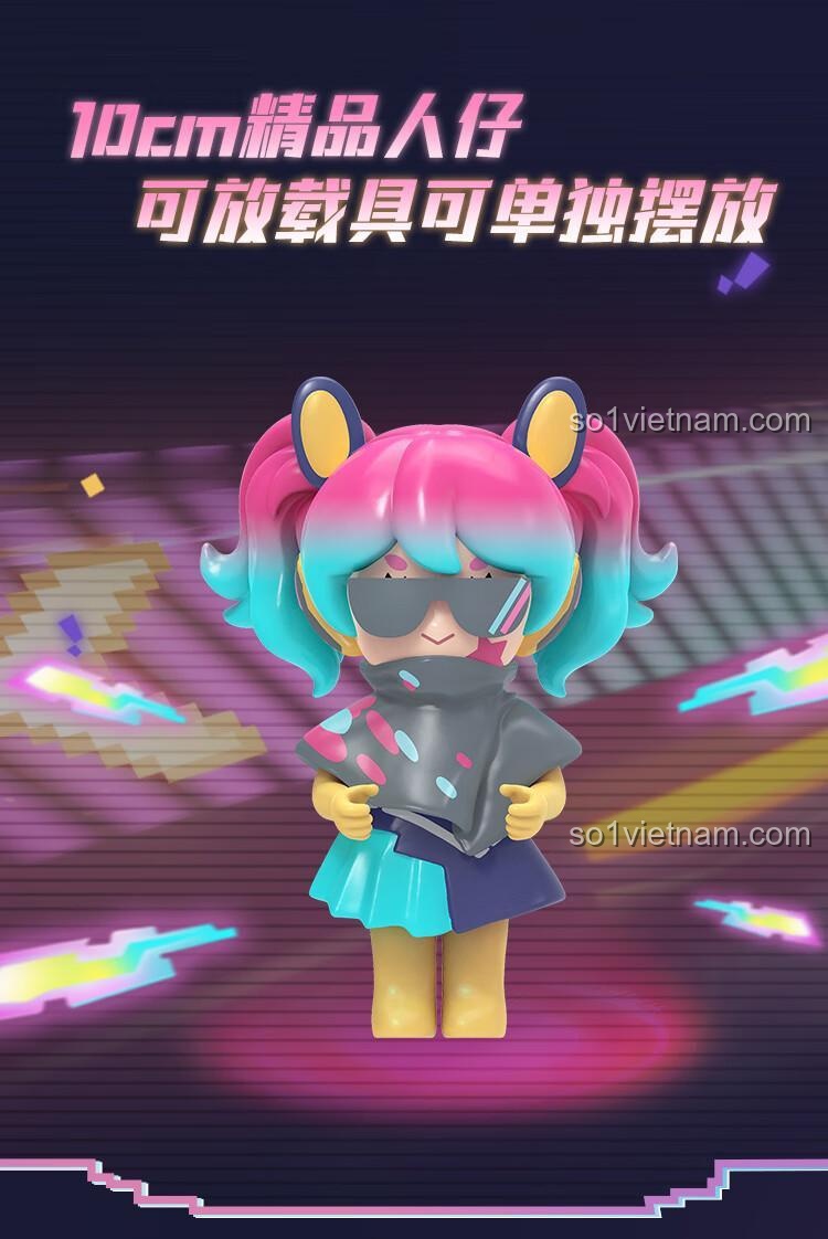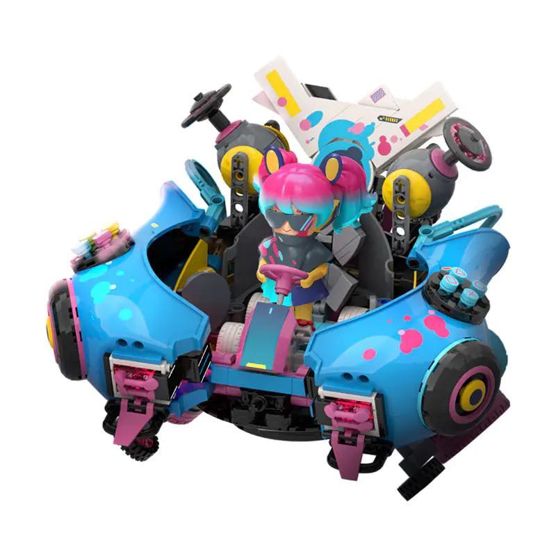 Ngay từ cái nhìn đầu tiên, bộ lắp ráp TOP TOY TC1811 đã gây ấn tượng mạnh mẽ bởi thiết kế đậm chất tương lai và màu sắc sống động. Tông màu chủ đạo Xanh lơ và Hồng được phối hợp hài hòa, điểm xuyết bằng các chi tiết màu Vàng và Đen, tạo nên một tổng thể bắt mắt, đúng với tinh thần ‘Arcade’ của skin gốc. Với kích thước ấn tượng sau khi hoàn thành là 24.2 cm dài, 22.1 cm rộng và 20.9 cm cao, mô hình có một vóc dáng bề thế, vững chãi, sẵn sàng để trưng bày ở bất kỳ góc nào trong phòng bạn. Điểm nhấn không thể không nhắc tới chính là figure Thái Văn Cơ cao 10cm đi kèm. Được chế tác tỉ mỉ, từ mái tóc hai màu cá tính, cặp kính râm sành điệu cho đến trang phục chi tiết, figure này đã lột tả được hết thần thái của nhân vật. Bạn có thể đặt cô nàng vào buồng lái của cỗ xe Thỏ Siêu Quậy, hoặc trưng bày riêng như một món đồ sưu tầm độc lập. Từng đường nét, từng chi tiết trên cỗ xe đều được chăm chút kỹ lưỡng, mang lại một vẻ đẹp công nghệ cao, vừa ngầu, vừa đáng yêu.