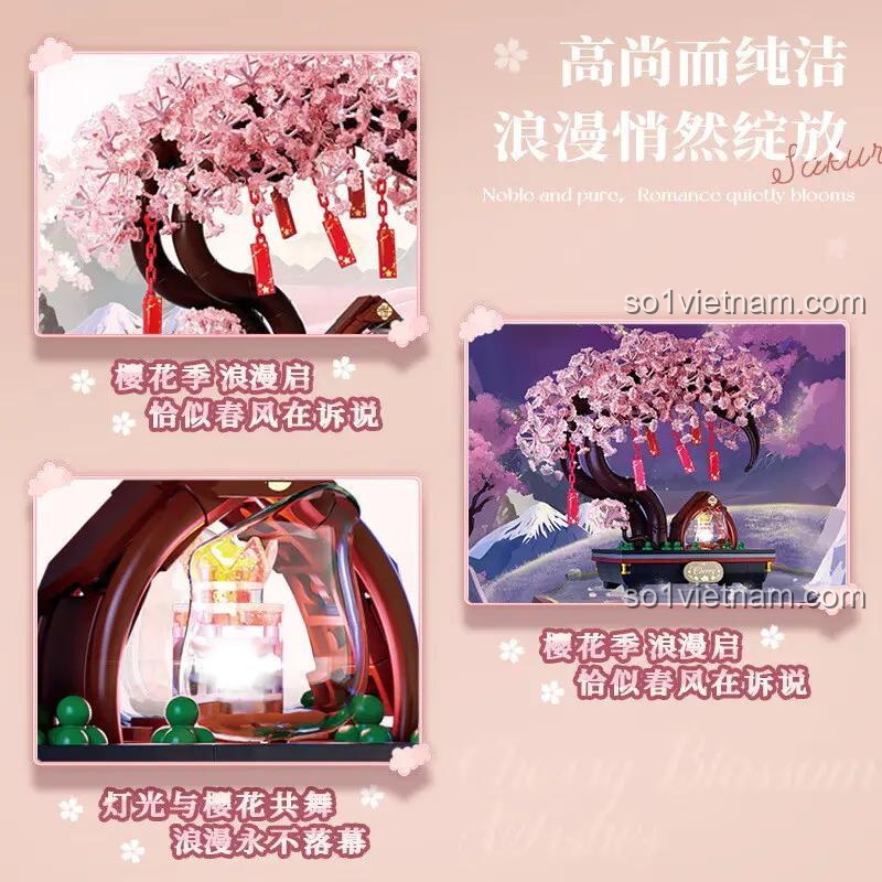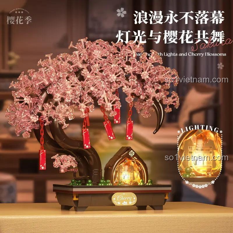 Bộ lắp ghép Duomeca D1311 tái hiện một cách chân thực và đầy nghệ thuật hình ảnh cây hoa anh đào nở rộ, với hàng ngàn cánh hoa màu hồng phấn mềm mại, đung đưa trong gió. Những chiếc đèn lồng đỏ treo lơ lửng trên cành cây càng làm tăng thêm vẻ lung linh, huyền ảo, gợi nhớ đến không khí lễ hội và những lời ước nguyện đẹp đẽ.