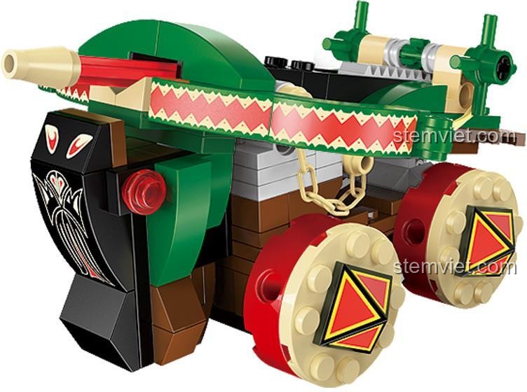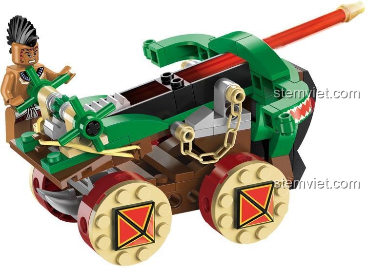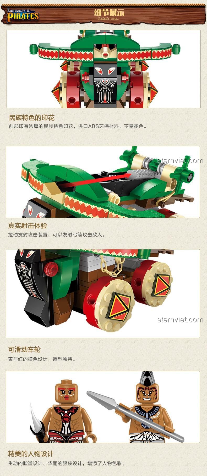 Bộ xếp hình Enlighten 1304 Nỏ Bắn Hình Đầu Trâu Của Hải Tặc Huyền Thoại gây ấn tượng mạnh với thiết kế vô cùng độc đáo và chi tiết. Chiếc xe nỏ được tạo hình đầu trâu mạnh mẽ, với màu sắc chủ đạo là xanh lá, nâu, đỏ, đen và kem, tạo nên vẻ ngoài cổ điển nhưng không kém phần dữ dằn. Với chiều dài mô hình 12.4 cm, chiều rộng 11 cm và chiều cao 7.2 cm, chiếc xe nỏ này có kích thước vừa phải, dễ dàng cho bé cầm nắm và điều khiển. Mỗi mảnh ghép đều được gia công tỉ mỉ, đảm bảo độ chính xác cao, giúp bé dễ dàng lắp ráp và tạo nên một mô hình hoàn chỉnh. Đặc biệt, bộ đồ chơi lắp ghép này còn đi kèm 2 minifigure chiến binh hải tặc và thợ săn hải tặc, được trang bị mũi giáo và dao găm, sẵn sàng cho mọi cuộc phiêu lưu. Các chi tiết thẩm mỹ như họa tiết dân tộc trên đầu nỏ càng làm tăng thêm vẻ tinh xảo và độc đáo cho bộ đồ chơi lắp ráp Xe Nỏ Hải Tặc này.