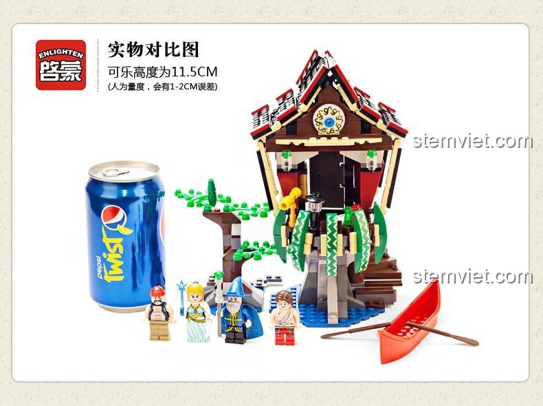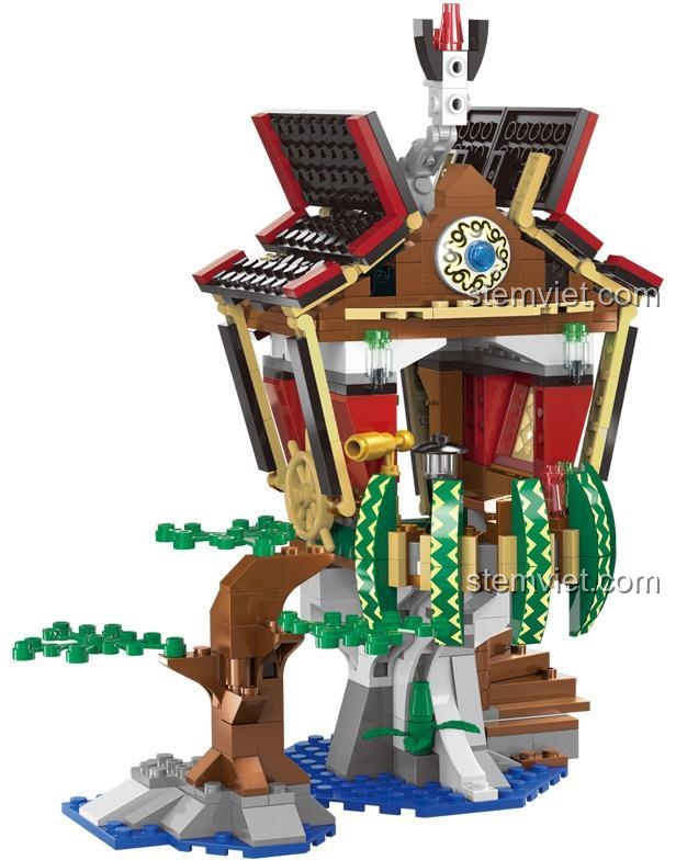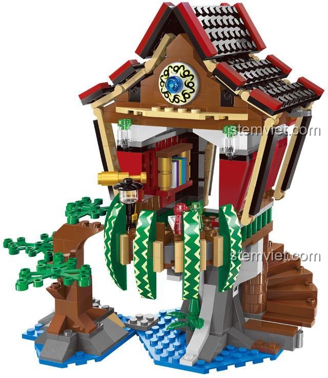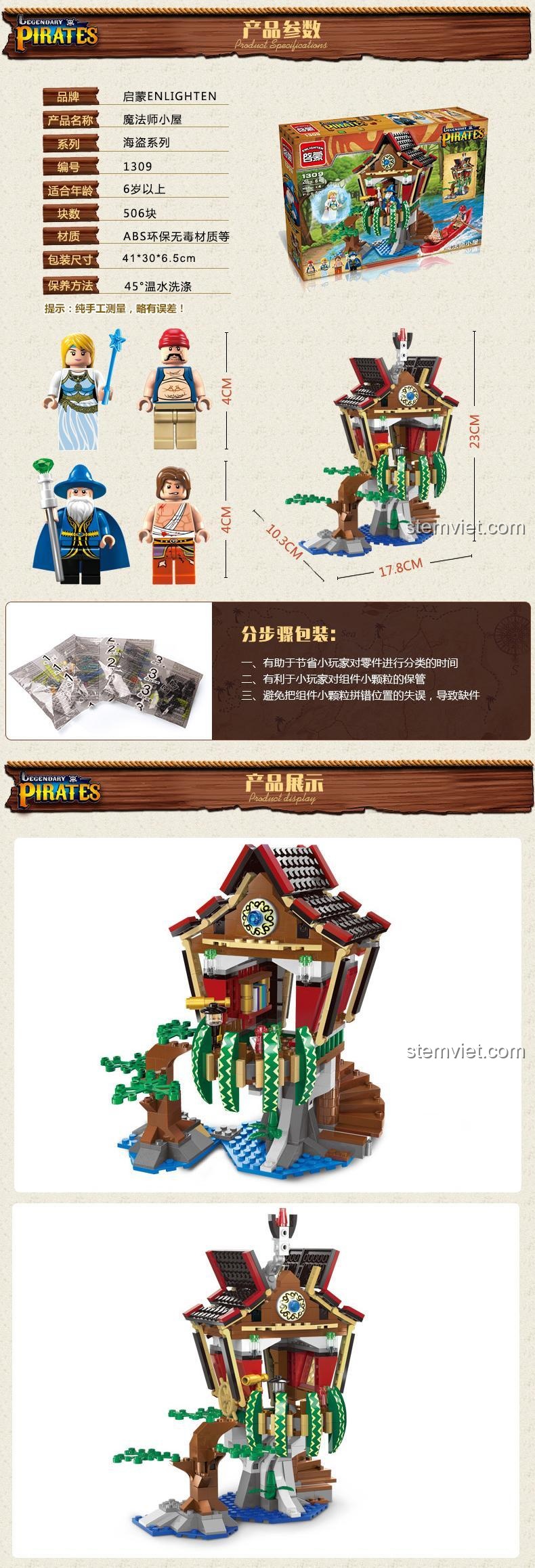 Ngôi nhà pháp sư Enlighten 1309 nổi bật với mái nhà có thể mở ra, một kính viễn vọng trên ban công để quan sát, và các vị trí đặc biệt trên cây để minifigure đứng, tăng cường khả năng tương tác và nhập vai cho bé.