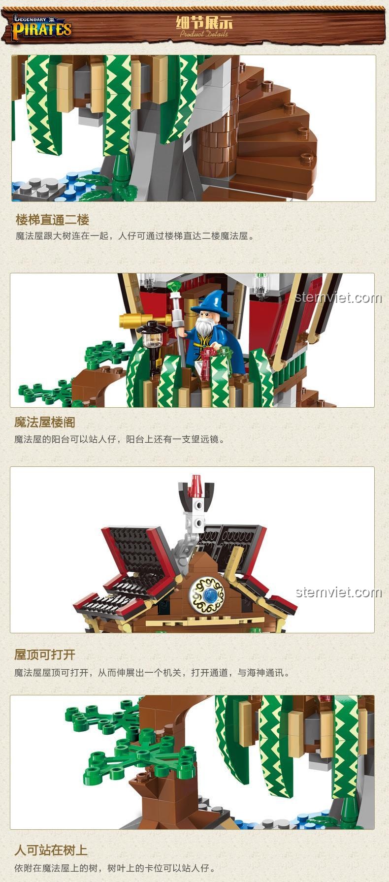 Bộ lắp ghép Ngôi nhà pháp sư của hải tặc huyền thoại Enlighten 1309 không chỉ đẹp mắt mà còn sở hữu nhiều tính năng đặc biệt, tăng cường trải nghiệm chơi của bé. Điểm nhấn nổi bật nhất là mái nhà có thể mở ra, tiết lộ một cơ chế ẩn bên trong, khơi gợi trí tò mò và khả năng khám phá của bé. Trên ban công của ngôi nhà, một chiếc kính viễn vọng được trang bị, cho phép các minifigure quan sát mọi động tĩnh từ xa, tạo nên những kịch bản phiêu lưu đầy kịch tính. Cây cối xung quanh ngôi nhà cũng được thiết kế thông minh với các vị trí đặc biệt, giúp minifigure có thể đứng vững, mở rộng không gian chơi và tương tác. Ngoài ra, bộ đồ chơi lắp ráp Enlighten 1309 còn đi kèm với một chiếc thuyền nhỏ, mái chèo, gậy phép thuật và kiếm, giúp bé tái hiện những cuộc truy đuổi trên biển hoặc những trận chiến phép thuật gay cấn. Các chi tiết này không chỉ tăng tính chân thực mà còn khuyến khích bé sáng tạo ra vô vàn câu chuyện và tình huống khác nhau.