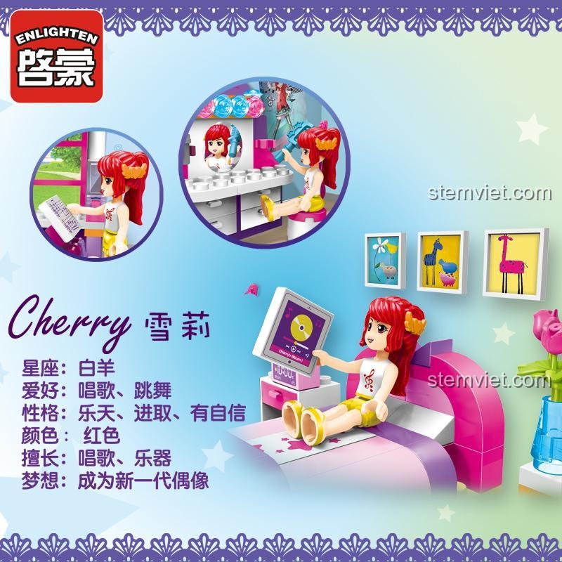 Chào mừng bạn đến với thế giới đầy màu sắc và âm nhạc của Cherry! Bộ đồ chơi lắp ráp phòng ngủ của Cherry từ Enlighten, mã số 2001, không chỉ là một món đồ chơi thông thường mà còn là cánh cửa mở ra không gian sáng tạo bất tận cho các bé gái yêu âm nhạc. Lấy cảm hứng từ nhân vật Cherry đáng yêu trong tác phẩm cùng tên, bộ lắp ghép này tái hiện chân thực căn phòng riêng tư của cô bé, nơi những giai điệu ngọt ngào được cất lên và những giấc mơ âm nhạc được ươm mầm. Bé sẽ được đồng hành cùng Cherry, cô nàng ca sĩ tài năng, để xây dựng và trang trí không gian riêng của mình, từ đó phát triển trí tưởng tượng và khả năng kể chuyện.