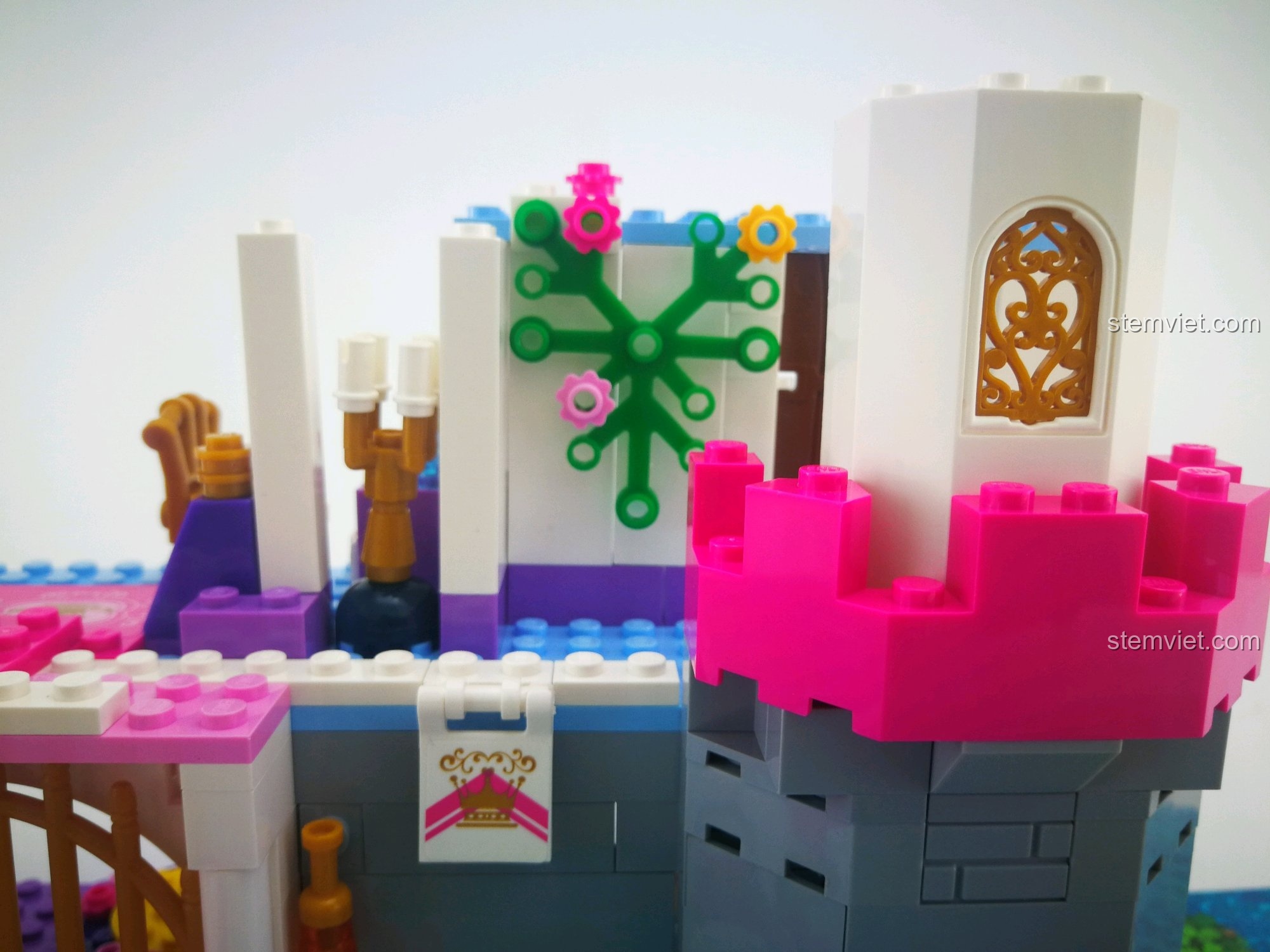 Bộ lắp ráp Enlighten 2612 Lâu Đài Thiên Thần Của Công Chúa Leah là một minh chứng cho sự tinh xảo trong thiết kế và sự chăm chút đến từng chi tiết. Với kiến trúc mang đậm phong cách châu Âu cổ điển, lâu đài công chúa 2612 nổi bật với những tháp cao, mái vòm duyên dáng và cổng thiên thần lộng lẫy. Màu sắc chủ đạo là hồng, trắng, tím và vàng kim, tạo nên một tổng thể hài hòa, rực rỡ và đầy chất thơ, đúng như một lâu đài cổ tích trong mơ.