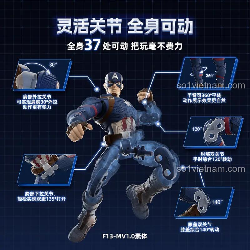 Figure Captain America CC-03 BLOKEES có tổng cộng 37 khớp cử động toàn thân, cho phép tạo dáng linh hoạt và đa dạng.
