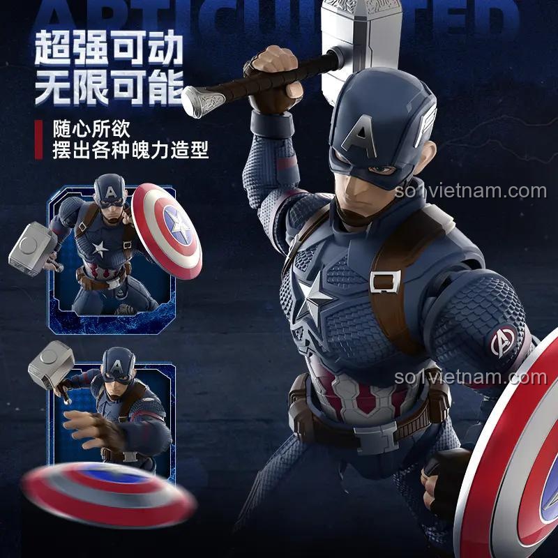 Figure Captain America CC-03 BLOKEES đi kèm với khiên Vibranium và búa Mjolnir, cho phép tái hiện khoảnh khắc Captain America cầm cả hai vũ khí.