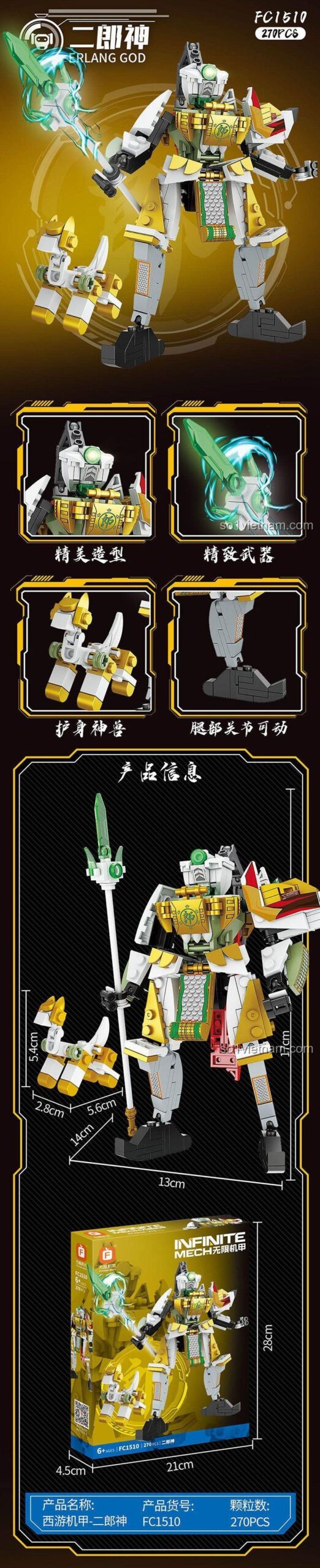 Dương Tiễn, hay còn gọi là Nhị Lang Thần, là một nhân vật vô cùng quen thuộc trong văn hóa dân gian Trung Quốc, đặc biệt nổi tiếng qua các tác phẩm kinh điển như Tây Du Ký. Ông được biết đến là một vị thần chiến binh tài ba, có sức mạnh phi thường, sở hữu pháp nhãn thiên mục trên trán có thể nhìn thấu mọi tà ma và luôn mang theo khuyển khuyển trung thành bên mình. Bộ lắp ghép Infinite Mech: Dương Tiễn Nhị Lang Thần FC1510 của Forange đã khéo léo tái hiện lại hình ảnh vị thần này dưới dạng một cỗ máy cơ giáp hiện đại, kết hợp giữa yếu tố truyền thống và công nghệ tương lai. Bé sẽ được tìm hiểu về câu chuyện của Nhị Lang Thần, về lòng dũng cảm, sự thông minh và sức mạnh bảo vệ chính nghĩa, qua đó khơi gợi niềm yêu thích với văn hóa và lịch sử.