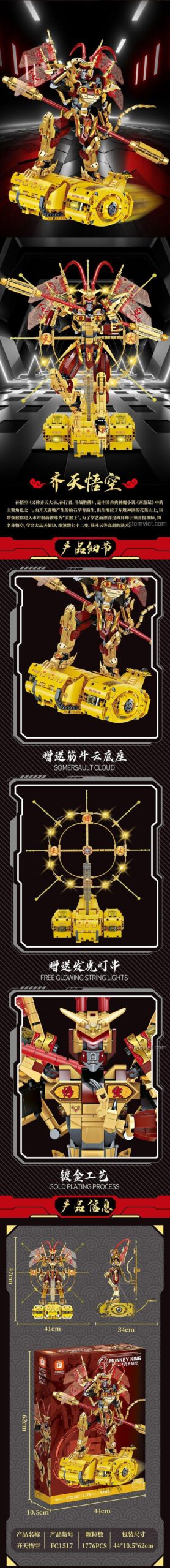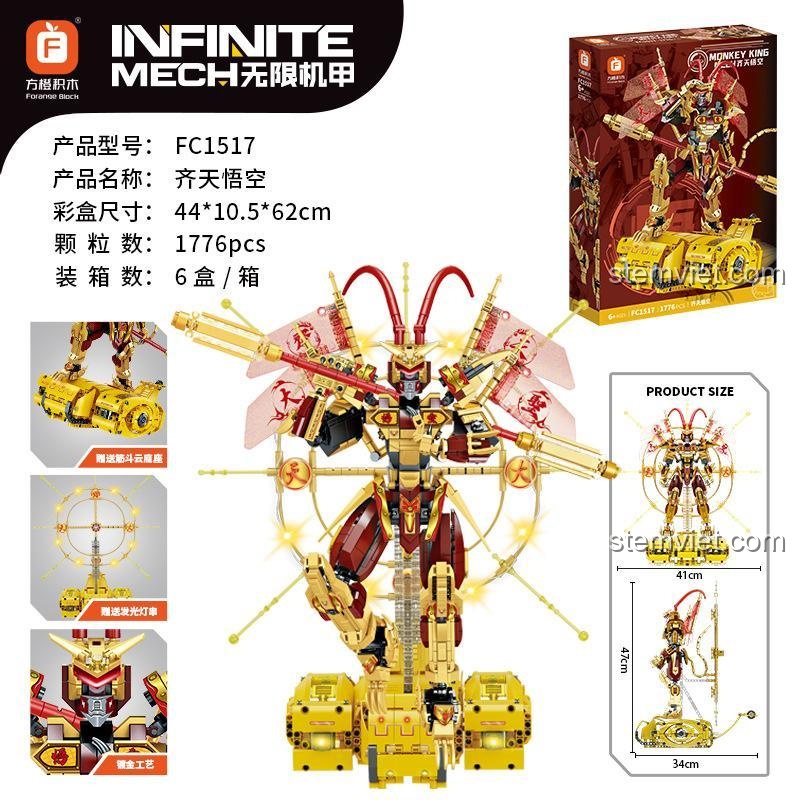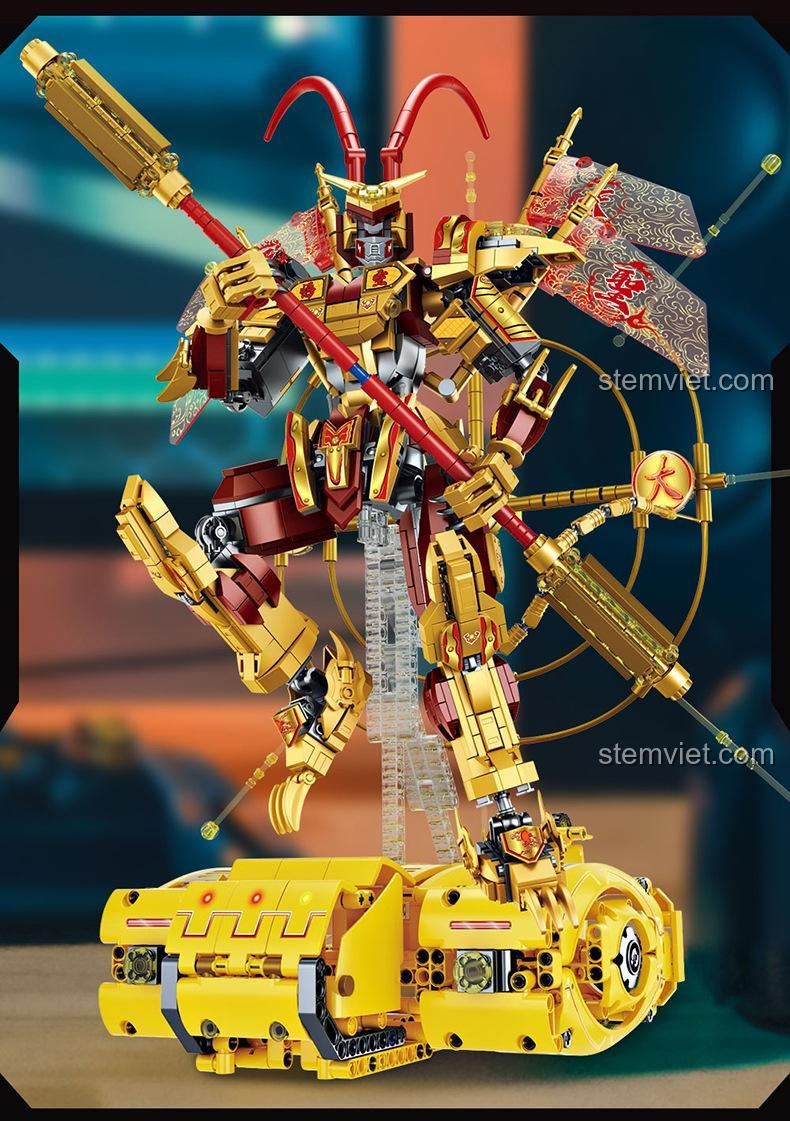 Ngay từ cái nhìn đầu tiên, đồ chơi mô hình Mech Tôn Ngộ Không FC1517 đã gây ấn tượng mạnh mẽ bởi vẻ ngoài cực kỳ hoành tráng và chi tiết. Với chiều cao lên tới 47cm, đây thực sự là một “người khổng lồ” trong thế giới đồ chơi lắp ráp, một tác phẩm nghệ thuật mà bất kỳ ai cũng phải trầm trồ. Tông màu chủ đạo Vàng – Đỏ – Đen được phối hợp hài hòa, vừa toát lên vẻ vương giả, quyền uy của Tề Thiên Đại Thánh, vừa mang đậm hơi thở công nghệ hiện đại.