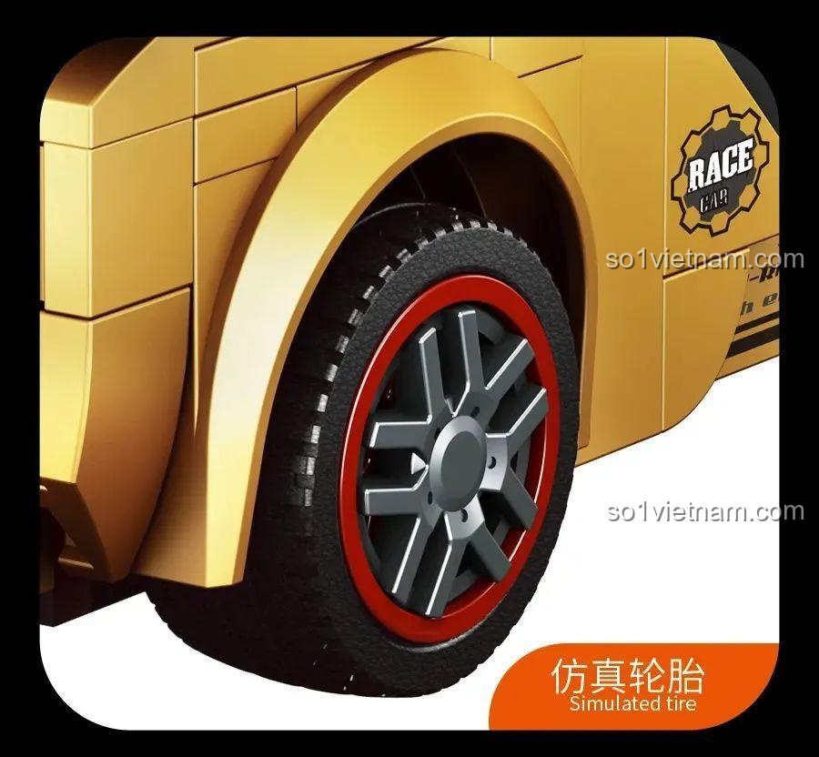 • Bánh xe mô phỏng: Bánh xe được thiết kế với vành đỏ và lốp có vân, giống hệt xe thật, giúp mô hình di chuyển mượt mà.