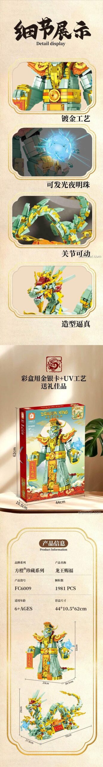 Với 1981 mảnh ghép được chế tác tỉ mỉ, đồ chơi mô hình Forange FC6009 là một công trình nghệ thuật thực sự. Mỗi chi tiết đều được thiết kế để tái hiện một cách chân thực nhất vẻ đẹp uy quyền của Long Vương. Mô hình sau khi hoàn thành có kích thước ấn tượng với chiều cao lên tới 35.5 cm, chiều rộng 24 cm, trở thành một vật trang trí đầy tự hào trong phòng của bé. Màu sắc chủ đạo là xanh lá và vàng gold, kết hợp hài hòa tạo nên vẻ ngoài vừa cổ điển, vừa sang trọng. Các chi tiết vảy rồng, móng vuốt, và biểu cảm gương mặt đều được chăm chút kỹ lưỡng, thể hiện thần thái của một vị vua. Đặc biệt, bộ sản phẩm cho phép lắp ráp thành 2 dạng khác nhau: dạng Long Vương hình người oai vệ và dạng Thanh Long uốn lượn dũng mãnh. Đây không chỉ là một mô hình tĩnh, mà là một tác phẩm nghệ thuật có thể biến đổi, mang lại trải nghiệm chơi đa dạng và không bao giờ nhàm chán.