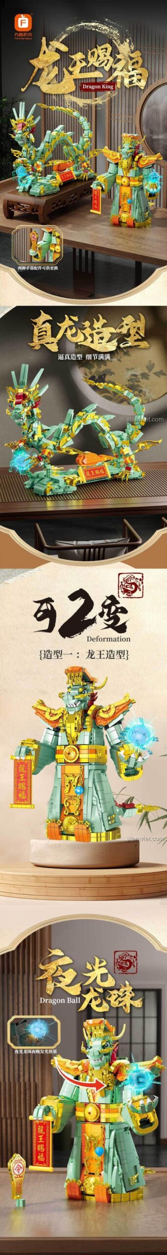 Mẹ có con trai 8 tuổi thân mến, có phải bé nhà mình luôn say mê những câu chuyện thần thoại, những sinh vật huyền bí mang trong mình sức mạnh phi thường? Nếu vậy, hãy cùng bé bước vào một cuộc phiêu lưu kỳ thú đến thế giới phương Đông, nơi ngự trị của Long Vương – vị thần cai quản biển cả, hô mưa gọi gió. Trong văn hóa Á Đông, Rồng không chỉ là biểu tượng của sức mạnh, quyền uy mà còn là linh vật mang lại may mắn, thịnh vượng. Bộ lắp ráp Forange FC6009 Long Vương Ban Phúc không chỉ là một món đồ chơi, mà là một cánh cổng đưa bé đến với thế giới của những huyền thoại, nơi bé có thể tự tay tạo nên vị Vua Rồng oai phong lẫm liệt của riêng mình. Từ hình tượng Long Vương uy nghi trong thần thoại Trung Hoa, sản phẩm này đã tái hiện một cách sống động và đầy sáng tạo, khơi dậy trí tưởng tượng và niềm đam mê khám phá văn hóa trong bé.