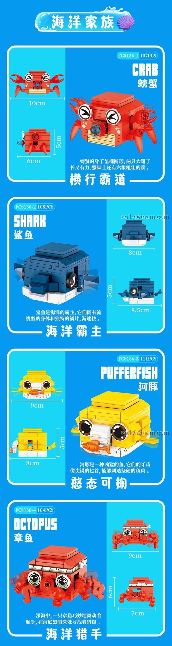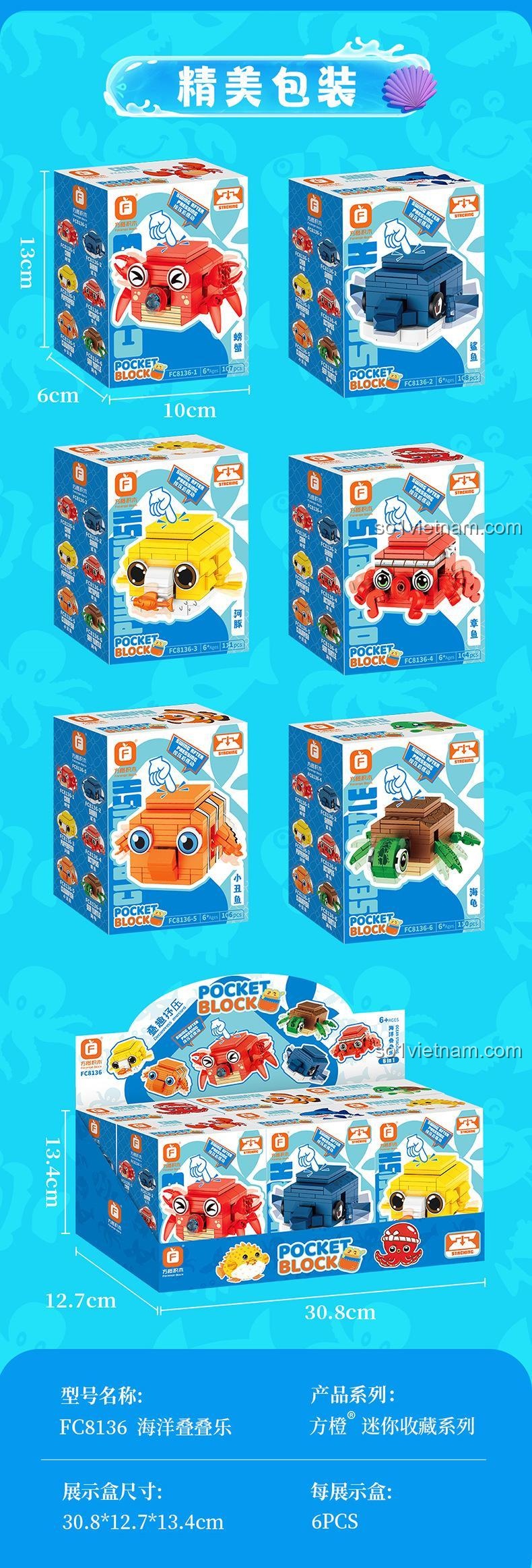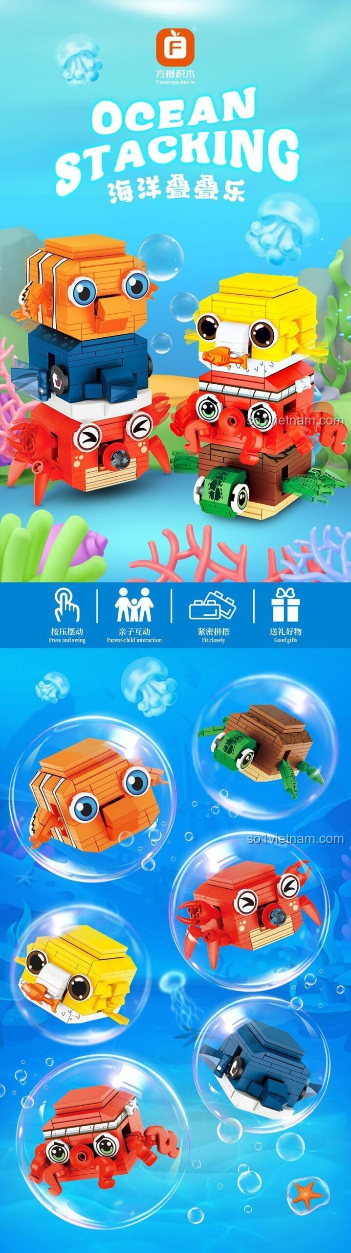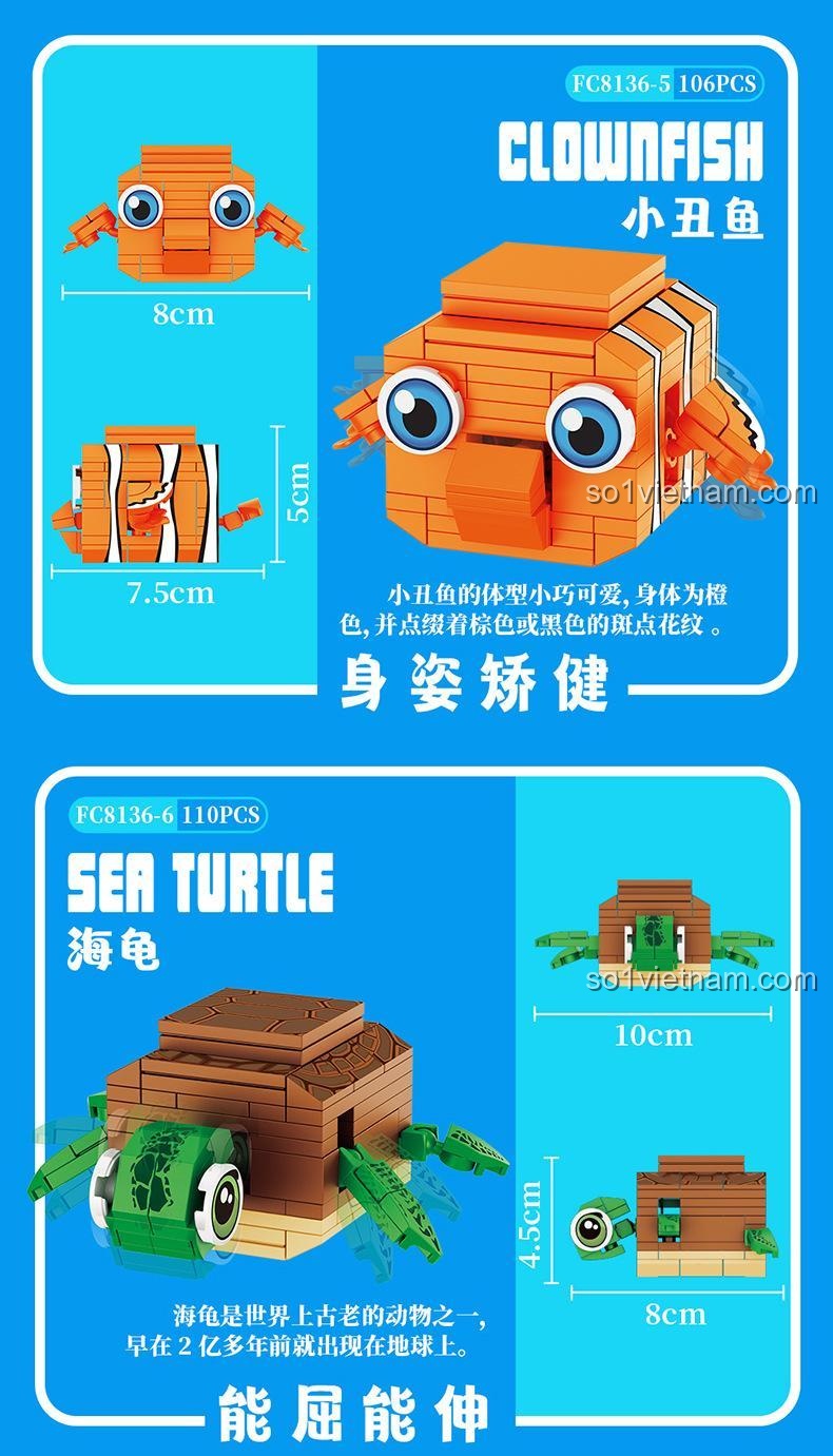 Bộ Forange FC8136 cho phép bé lắp ráp 6 mẫu sinh vật biển khác nhau: cua, cá mập, cá nóc, bạch tuộc, cá hề và rùa biển. Bé có thể tháo ra và lắp lại theo hướng dẫn hoặc thỏa sức sáng tạo theo ý thích.
