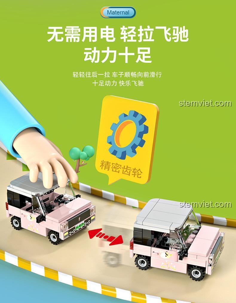 Điểm nhấn làm nên sự khác biệt của bộ xếp hình FC8279 chính là tính năng ‘pull-back’ – động cơ kéo lùi. Không cần pin, không cần sạc điện, cuộc vui của bé sẽ không bao giờ bị gián đoạn. Chỉ cần một thao tác đơn giản: đặt xe xuống sàn, kéo nhẹ về phía sau để lên dây cót, và thả tay! Chiếc xe sẽ lao đi với tốc độ đáng kinh ngạc nhờ cơ chế bánh đà và bánh xe cao su chống trượt. Bé có thể tổ chức những giải đua Grand Prix ngay trong phòng khách, thi xem xe nào chạy nhanh nhất, xa nhất, hay tạo ra những cú va chạm đầy kịch tính. Một số mẫu xe còn có những chi tiết thú vị như cửa mở được hay đèn lật như chiếc AE86, tăng thêm phần hấp dẫn khi chơi.