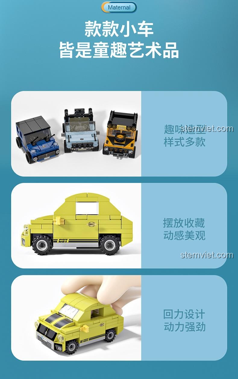 Bùng nổ đường đua với Bộ Sưu Tập 12 Xe Hơi Mini Q-Style Forange FC8279! Với 1090 mảnh ghép chất lượng cao, bé sẽ được tự tay lắp ráp 12 mẫu xe huyền thoại như Porsche 911, Toyota AE86, Jeep Wrangler… theo phong cách chibi siêu đáng yêu. Mỗi chiếc xe đều được trang bị động cơ kéo lùi mạnh mẽ, chỉ cần kéo nhẹ là có thể lao vút đi, tạo nên những cuộc đua đầy phấn khích. Đây là món đồ chơi giáo dục tuyệt vời cho bé trai từ 6 tuổi, giúp rèn luyện sự khéo léo, tư duy và sáng tạo. Một lựa chọn thông minh, giá siêu tiết kiệm cho một bộ sưu tập hoành tráng!