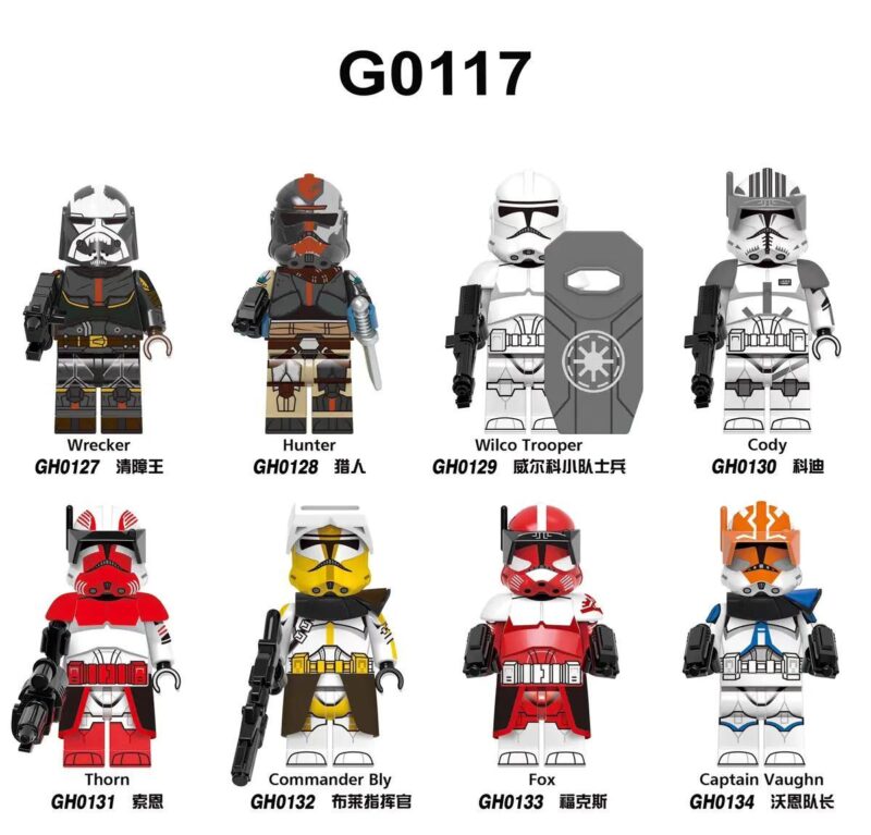 Bộ đồ chơi mô hình Lính Clone Star Wars G0117 bao gồm 8 nhân vật minifigure: Wrecker, Hunter, Wilco Trooper, Cody, Thorn, Commander Bly, Fox và Captain Vaughn. Mỗi nhân vật đều có thiết kế độc đáo và phụ kiện riêng.