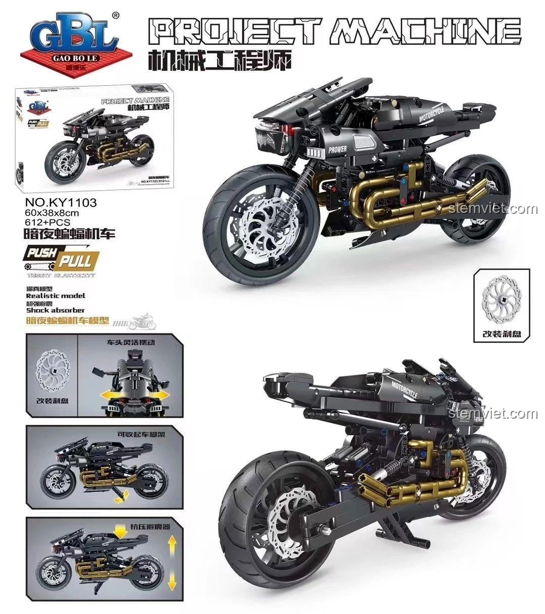 Bùng nổ đam mê tốc độ và hóa thân thành Hiệp sĩ Bóng đêm cùng bộ lắp ráp **GBL KY1103 Xe Mô tô Batcycle Hắc Ám**! Với 612 mảnh ghép theo phong cách Technic đầy thử thách, đây không chỉ là một món đồ chơi thông thường. Mô hình sở hữu thiết kế ‘Chiến Mã Bóng Đêm’ cực ngầu, hầm hố đến từng chi tiết, từ hệ thống ống xả mạ vàng cho đến phanh đĩa chân thực. Điểm nhấn không thể bỏ qua chính là **động cơ kéo lùi (pull-back) cực mạnh**, chỉ cần kéo nhẹ và thả tay, chiếc Batcycle sẽ lao vút đi đầy uy lực. Sản phẩm làm từ nhựa ABS cao cấp, an toàn tuyệt đối cho bé trai từ 6 tuổi. Đây là lựa chọn thay thế tiết kiệm cho LEGO®, mang lại trải nghiệm lắp ráp đỉnh cao với mức giá hợp túi tiền, giúp bé rèn luyện sự kiên nhẫn, tư duy logic và thỏa sức sáng tạo.