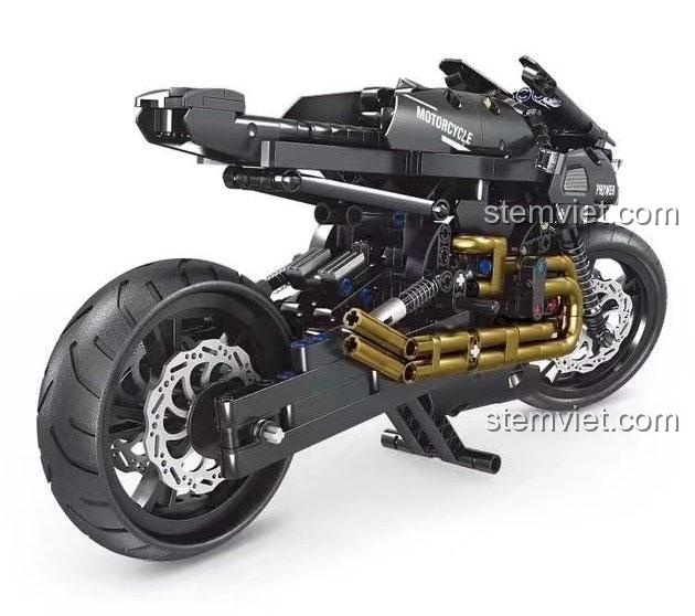 Ngay từ cái nhìn đầu tiên, đồ chơi mô hình GBL KY1103 đã gây ấn tượng mạnh mẽ với vẻ ngoài cực kỳ hầm hố và gai góc. Toàn bộ mô hình được bao phủ bởi màu đen tuyền huyền bí, điểm xuyết bằng những chi tiết ống xả màu vàng đồng nổi bật, tạo nên một tổng thể vừa mạnh mẽ vừa sang trọng. Với kích thước ấn tượng dài 32.7 cm, rộng 13.3 cm và cao 17.1 cm sau khi hoàn thành, đây là một mô hình trưng bày hoành tráng trong bất kỳ bộ sưu tập nào. Từng chi tiết, từ bộ khung sườn theo phong cách Technic, cặp phuộc giảm xóc, phanh đĩa cho đến yên xe và đầu đèn, đều được tái hiện một cách tỉ mỉ. Thiết kế này không chỉ đẹp mắt mà còn mang lại trải nghiệm lắp ráp đầy logic và cuốn hút, giúp bé trai 6 tuổi phát triển khả năng quan sát và tư duy không gian.
