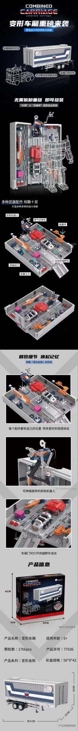 Điểm đặc biệt của bộ lắp ghép 77036 là khả năng biến hình linh hoạt. Chiếc rơ-moóc có thể được tháo rời và lắp ráp lại để trở thành một trạm chiến đấu di động với nhiều tính năng như cửa mở, robot gắp có thể xoay và thu gọn, cùng hiệu ứng đèn LED và âm thanh sống động.