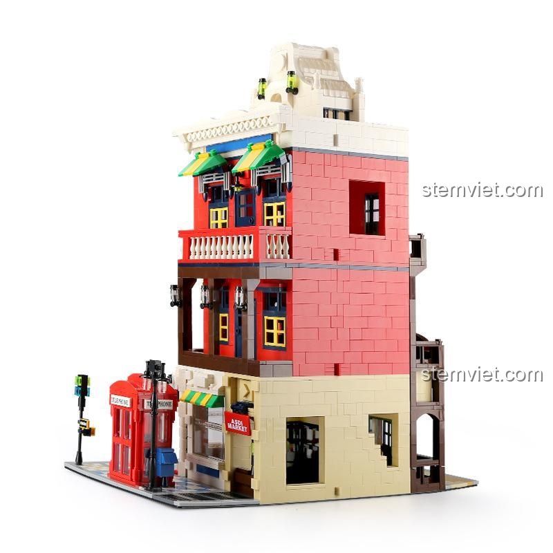 Bạn sẽ bị cuốn hút bởi những chi tiết nhỏ nhưng đầy ấn tượng: từ những ô cửa sổ lớn với rèm cửa tinh xảo, những mái hiên sọc xanh trắng đặc trưng, cho đến chiếc bốt điện thoại công cộng màu đỏ nổi bật và cột đèn đường cổ điển. Mỗi chi tiết đều góp phần tạo nên một bức tranh sống động về một góc phố châu Âu lãng mạn. Bộ đồ chơi mô hình này không chỉ tái hiện kiến trúc bên ngoài mà còn gợi mở không gian bên trong, khuyến khích người chơi tự do sáng tạo nội thất theo ý muốn. Đây thực sự là một bộ xếp hình Kiến trúc cửa hàng mà bất kỳ ai yêu thích sự hoàn hảo đều không thể bỏ qua.