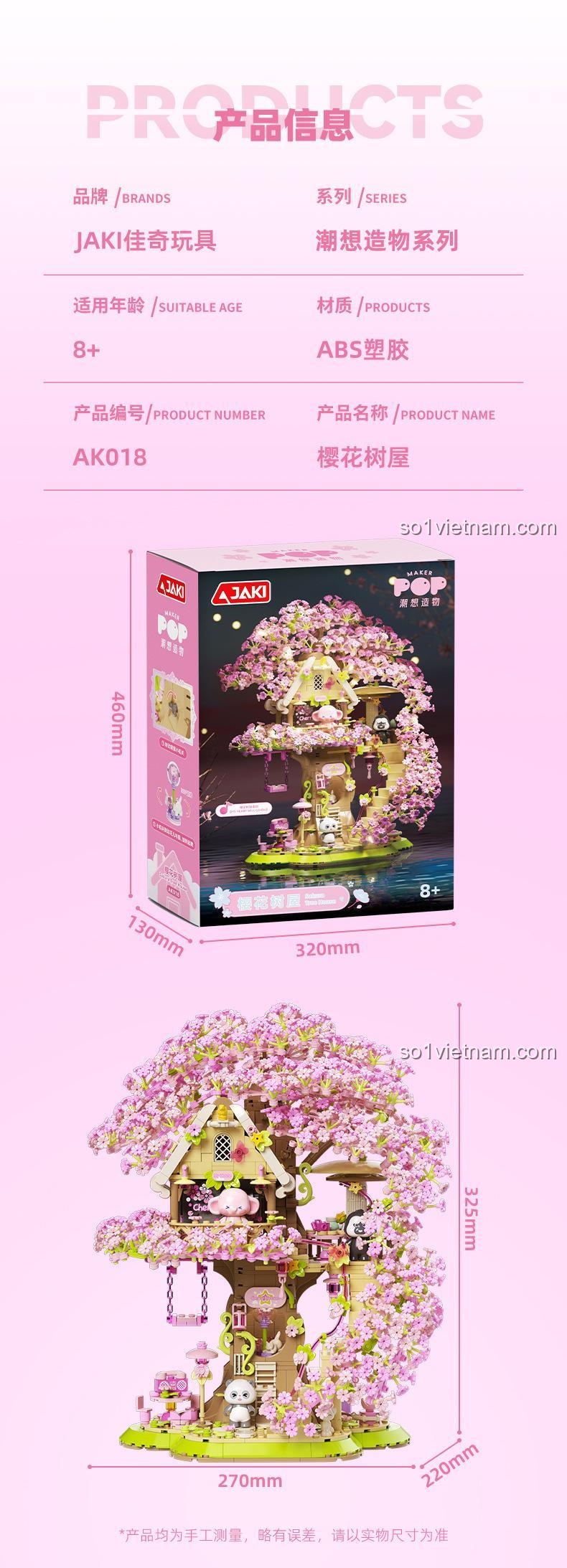 Sau khi hoàn thành, mô hình JAKI AK 018 Nhà Cây Hoa Anh Đào có kích thước khá lớn và đẹp mắt là: dài 27 cm, rộng 22 cm và cao 32.5 cm. Đây sẽ là một vật trang trí tuyệt đẹp cho góc học tập hoặc phòng ngủ của bé.