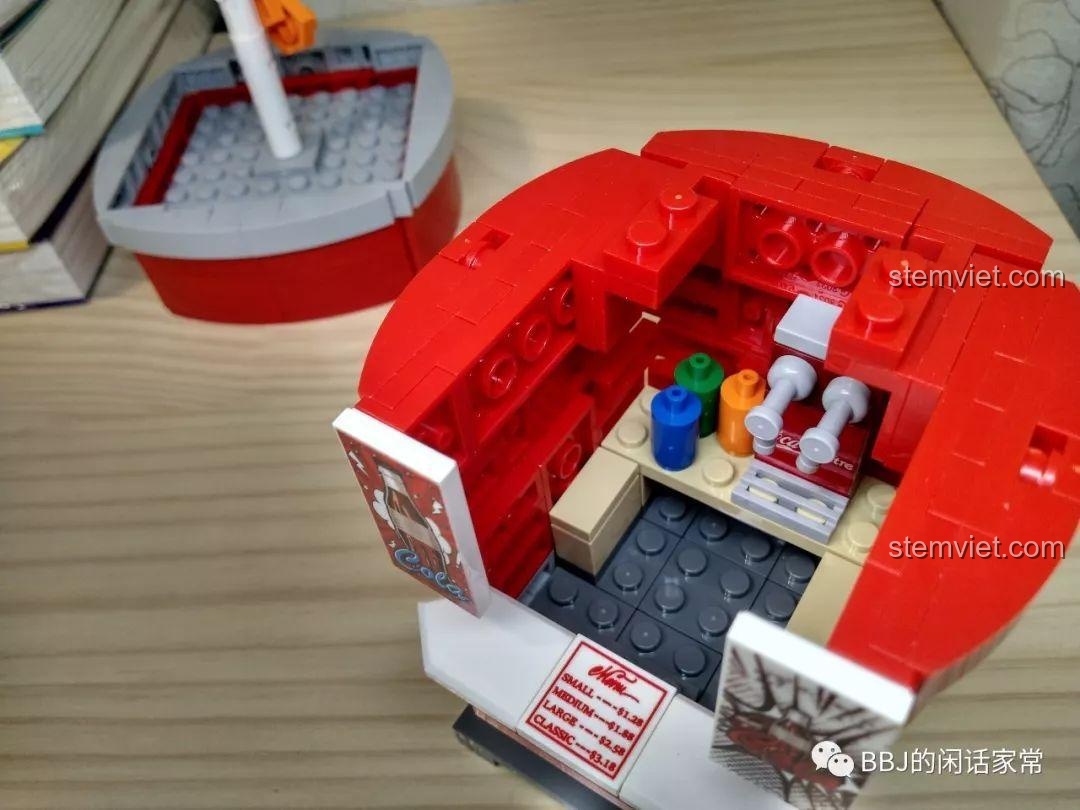 Điểm “ăn tiền” nhất của bộ đồ chơi này chính là thiết kế độc nhất vô nhị! Toàn bộ cửa hàng được tạo hình như một chiếc cốc Coca-Cola khổng lồ, một ý tưởng vừa thông minh vừa cực kỳ bắt mắt. Với hai tông màu chủ đạo là Đỏ và Trắng đặc trưng, kết hợp với màu Xám bạc hiện đại, mô hình này nổi bật ở bất cứ đâu nó xuất hiện.