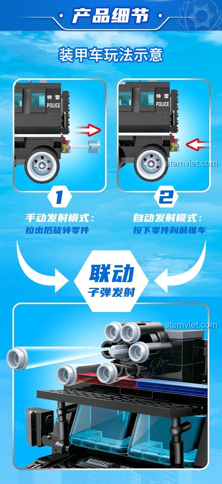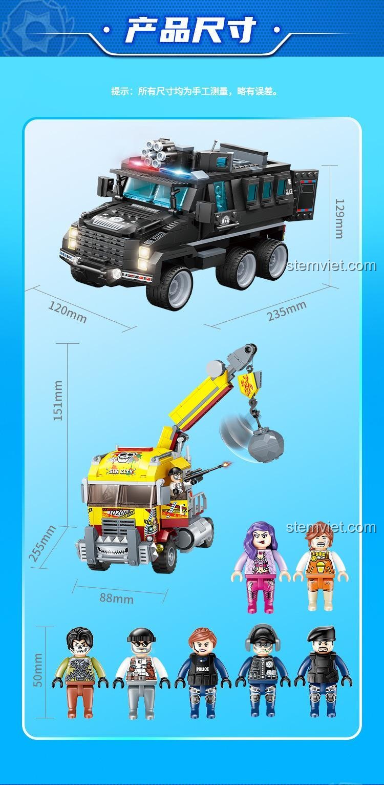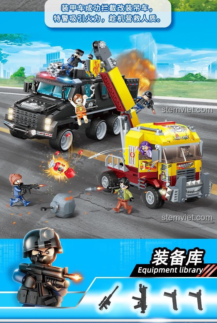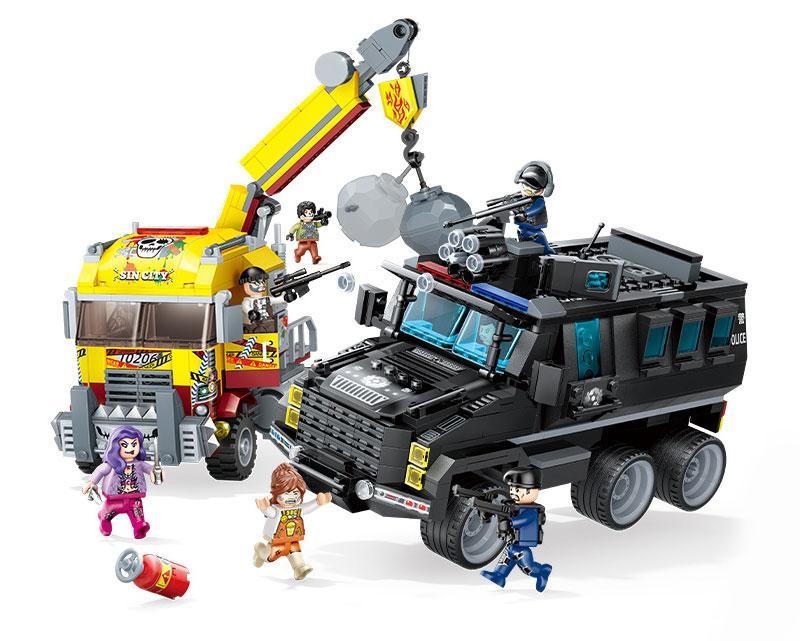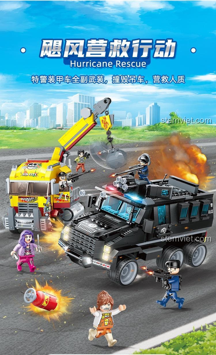 Trong bối cảnh thành phố hiện đại, nơi tội phạm luôn rình rập, đội cảnh sát tinh nhuệ với những chiếc xe bọc thép và xe cứu hộ chuyên dụng luôn sẵn sàng lên đường. Bé sẽ vào vai chỉ huy, điều động lực lượng, lên kế hoạch tác chiến để nhanh chóng vô hiệu hóa kẻ xấu và giải cứu những người dân vô tội. Chiếc xe cảnh sát đặc nhiệm với khả năng bắn đạn nhựa sẽ là vũ khí lợi hại, trong khi chiếc xe cứu hộ với cần cẩu linh hoạt sẽ giúp bé thực hiện các nhiệm vụ giải cứu phức tạp.