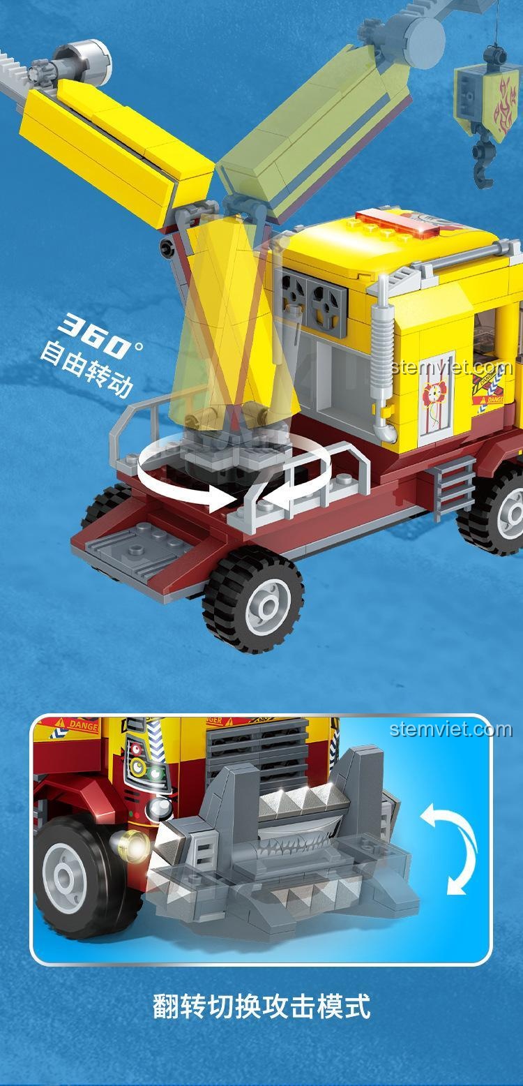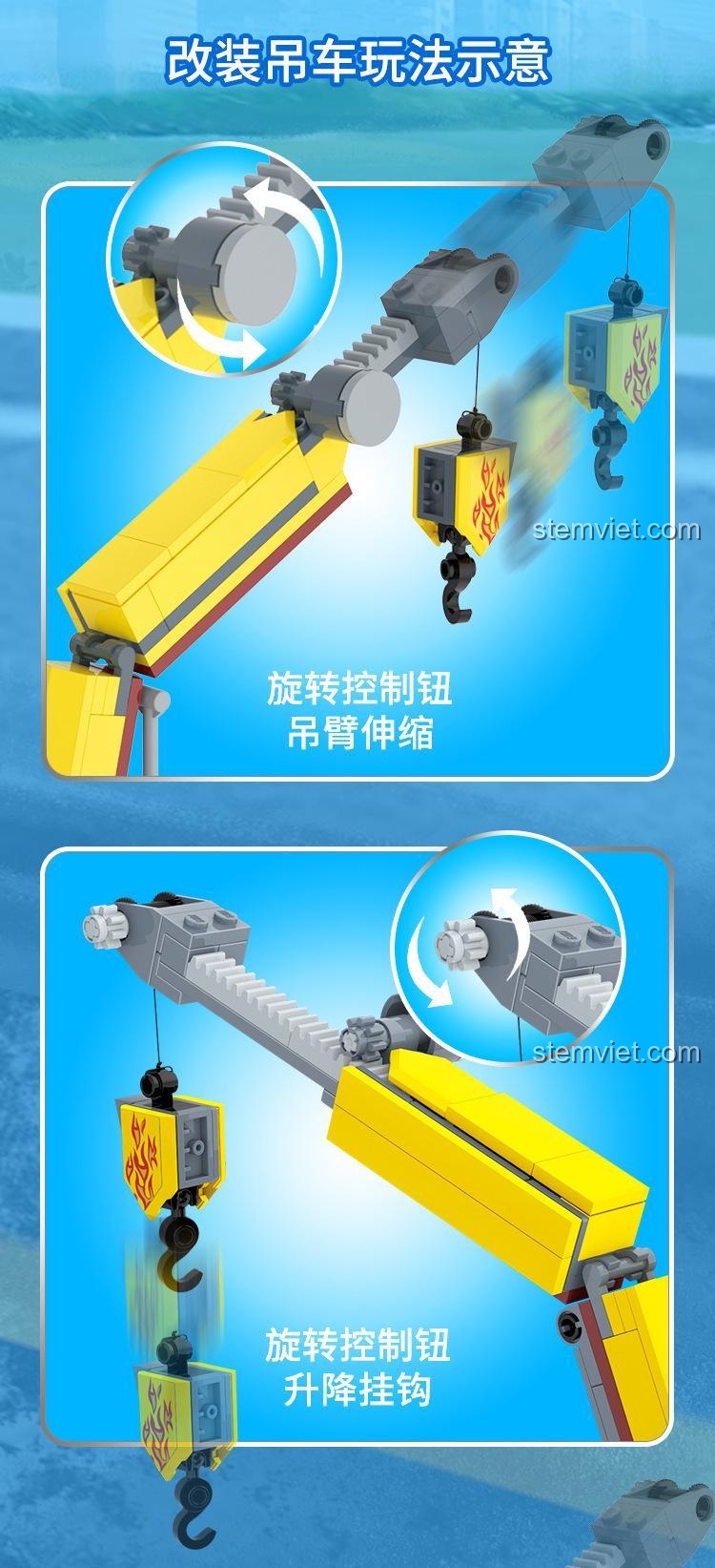 • Cần cẩu linh hoạt: Cần cẩu có thể xoay 360 độ, nâng hạ và kéo dài, giúp bé thực hiện các nhiệm vụ giải cứu phức tạp như nâng vật nặng, kéo xe bị nạn.