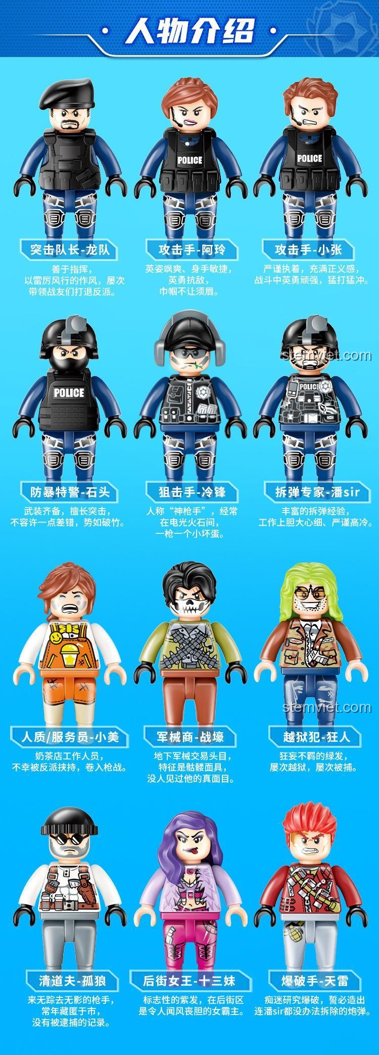 Minifigures: Bộ sản phẩm đi kèm 6 minifigures với các trang phục và phụ kiện đa dạng, từ cảnh sát trang bị súng, đội trưởng chỉ huy, đến nhân viên cứu hộ, mang đến sự sống động cho câu chuyện.
