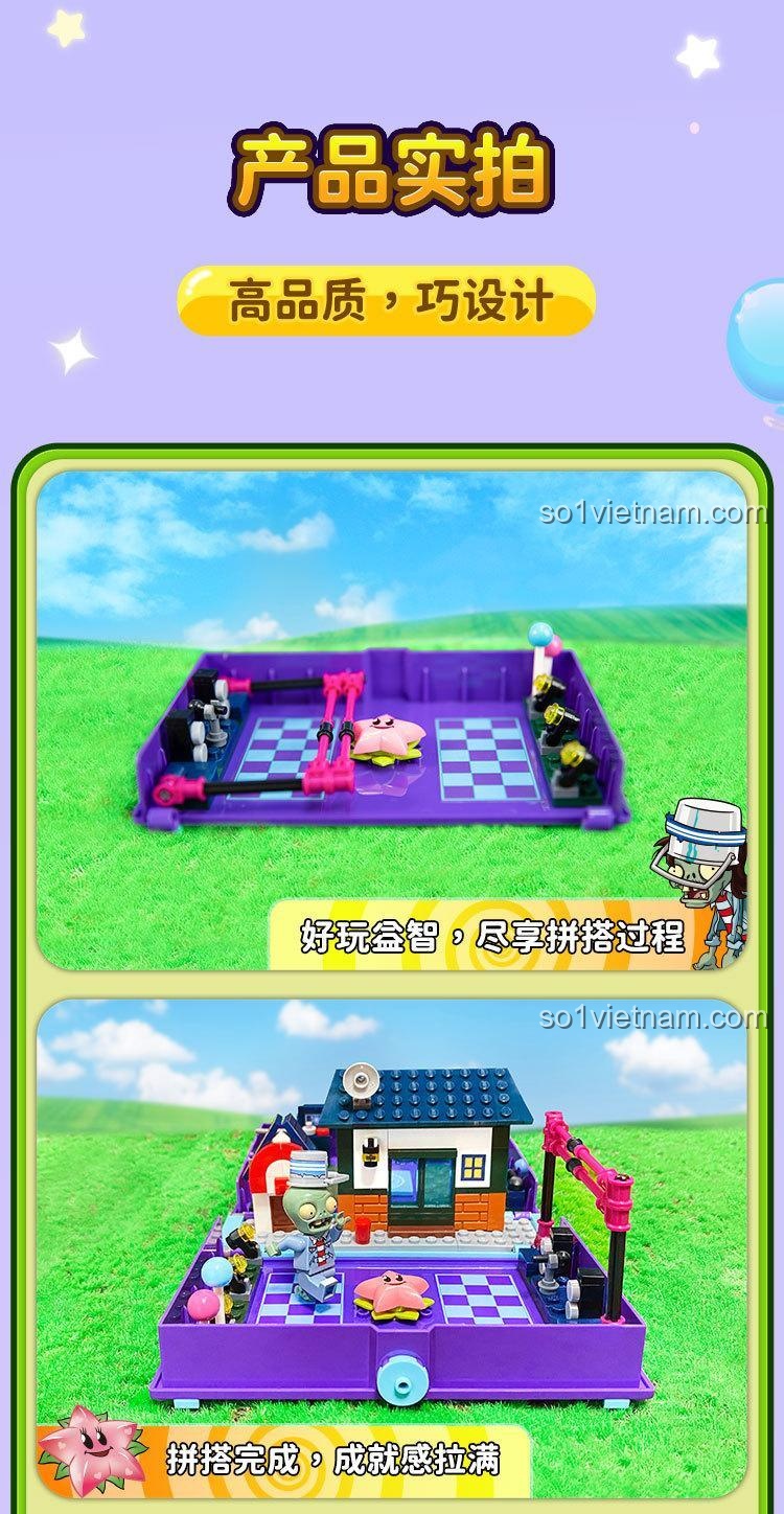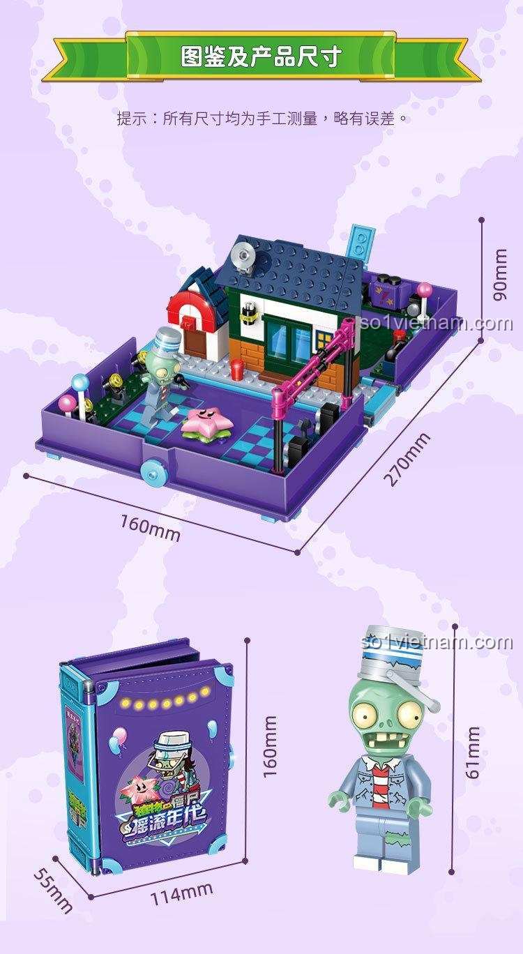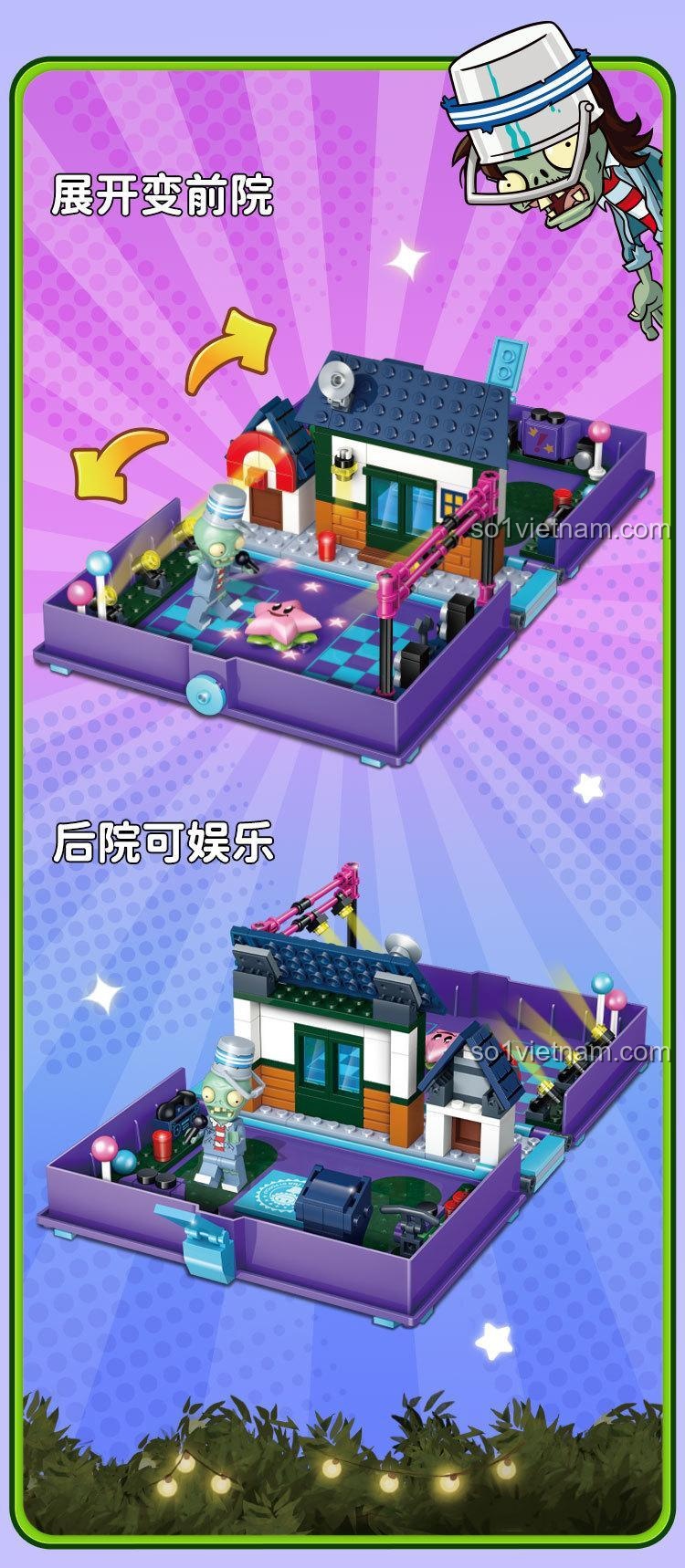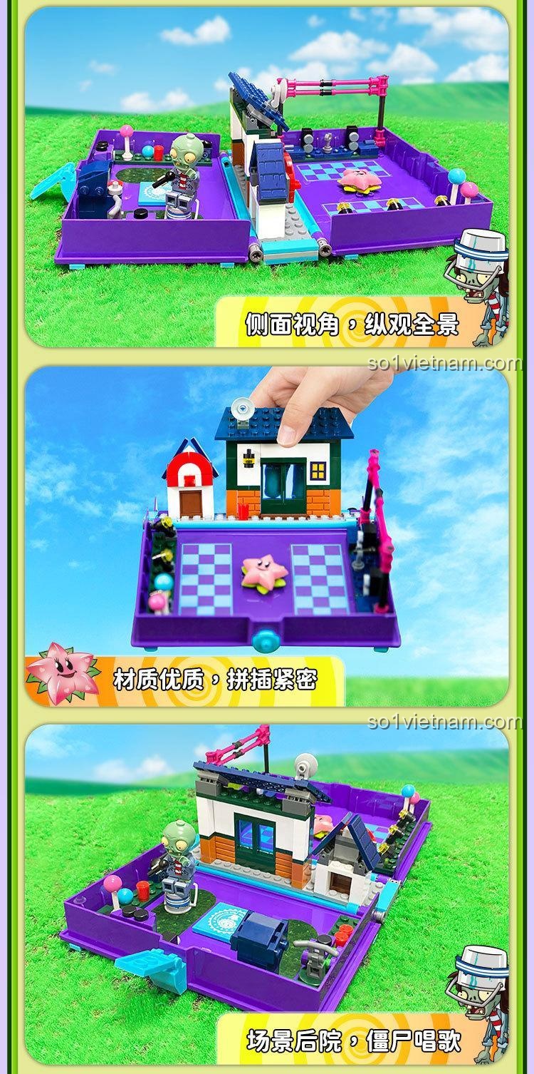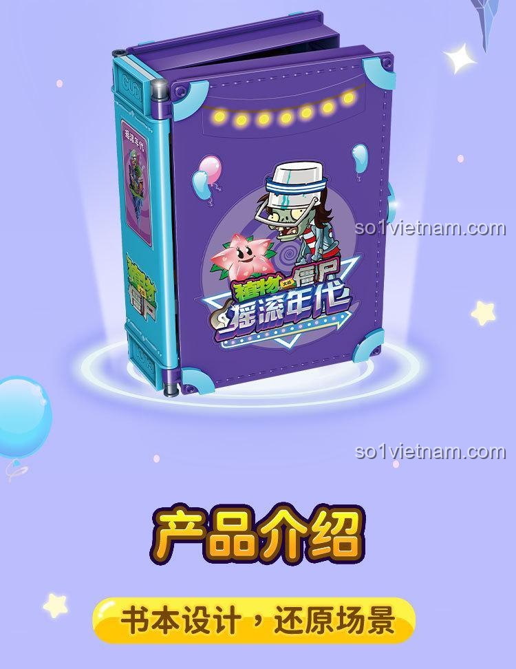 Điểm đặc biệt nhất là thiết kế 2 trong 1: vừa là một cuốn sách nhỏ gọn, vừa mở ra thành một sân khấu chiến đấu Plants vs. Zombies sống động. Ngoài ra, mô hình còn có cột sân khấu có thể nâng hạ và đi kèm 2 minifigures nhân vật Thiên Thần Sao Biển và Zombie Xô Sắt Rock.
