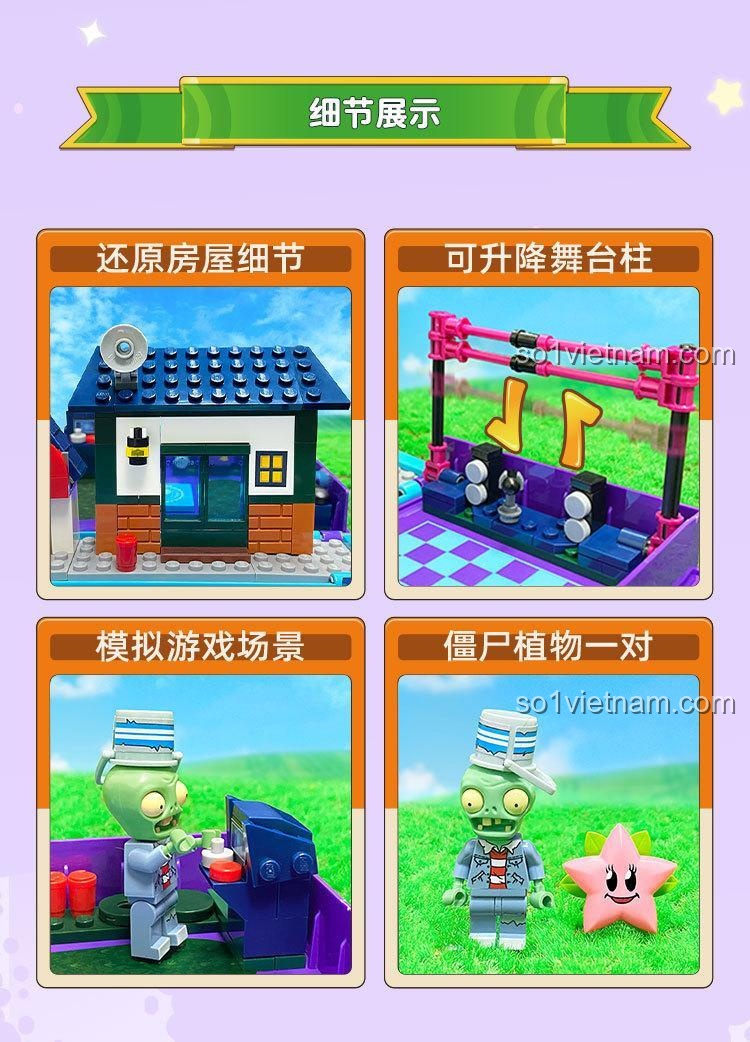 Mô hình được thiết kế tỉ mỉ với màu sắc chủ đạo là tím, xanh lá, trắng, đen, cam và hồng, tạo nên một tổng thể hài hòa và bắt mắt. Bộ đồ chơi đi kèm 2 minifigures cực kỳ chi tiết: Thiên Thần Sao Biển đáng yêu và Zombie Xô Sắt Rock ngầu lòi, sẵn sàng cho mọi cuộc đối đầu. Đặc biệt, mô hình còn có một cột sân khấu có thể nâng hạ, tăng thêm tính tương tác và kịch tính cho các trận chiến. Mỗi chi tiết đều được chăm chút, từ những viên gạch nhỏ xây nhà đến các phụ kiện trang trí, tất cả đều góp phần tạo nên một Mô hình Plants vs. Zombies 60029 chân thực và cuốn hút.
