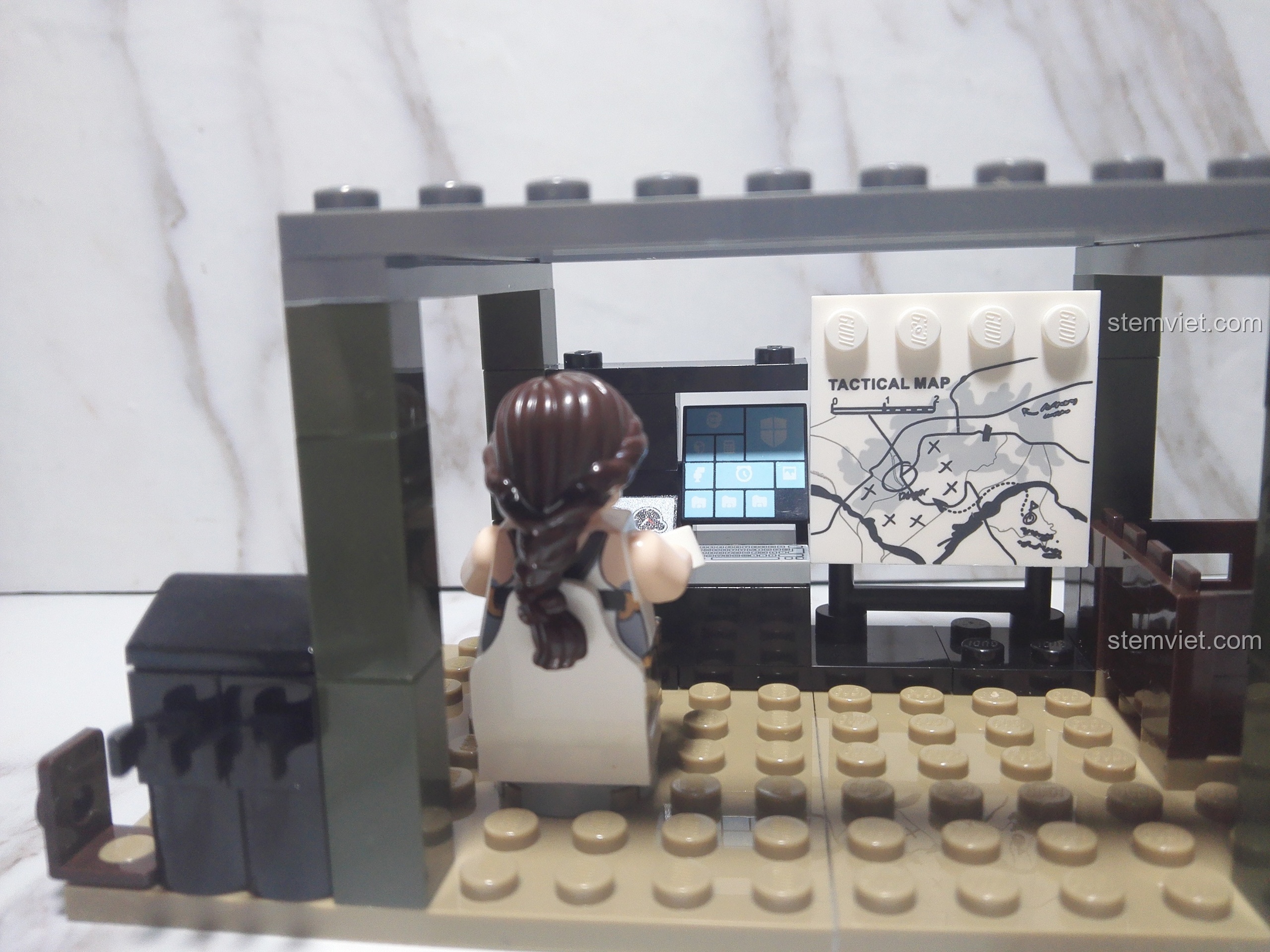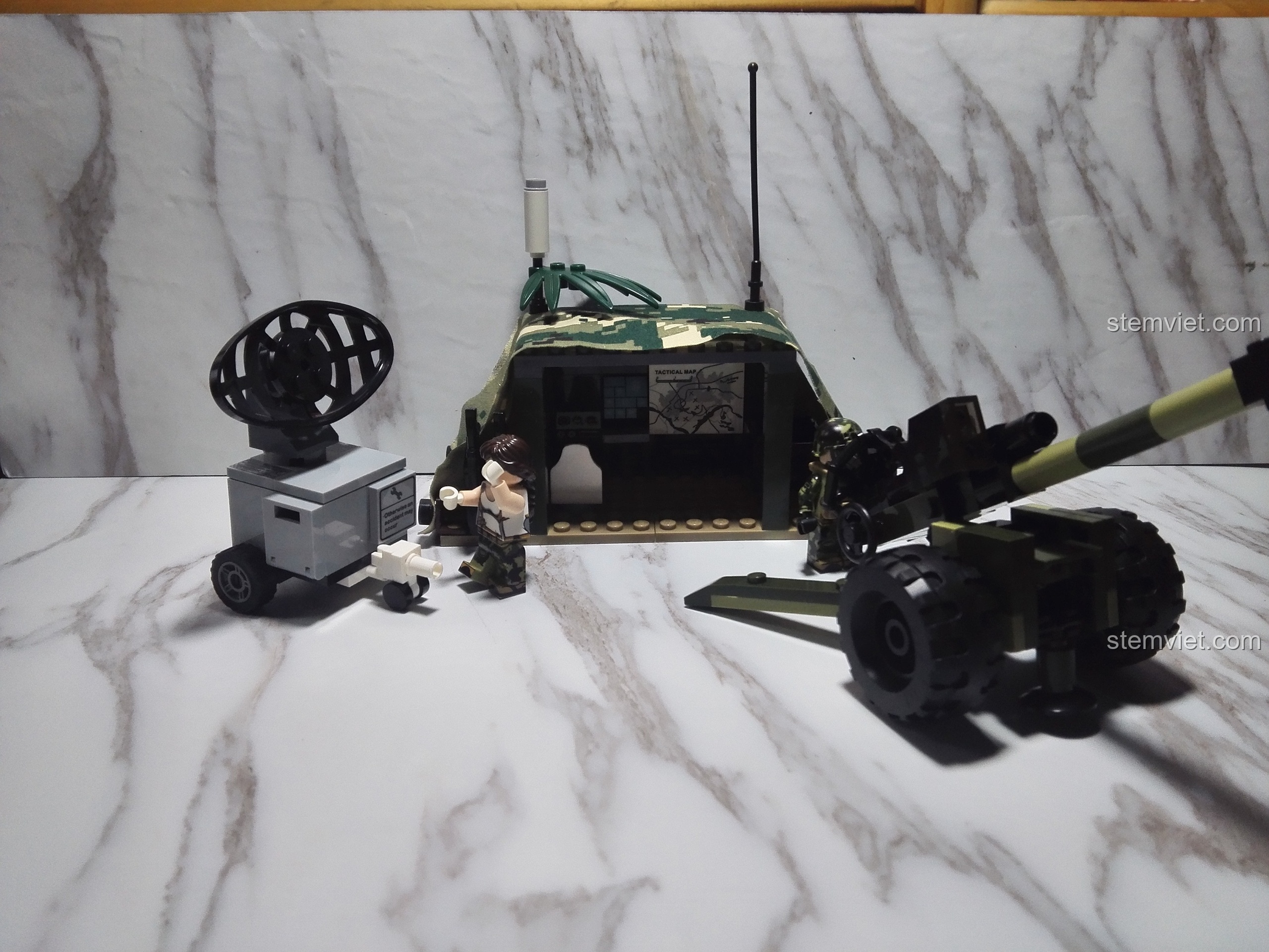 Với 185 chi tiết được chế tác tỉ mỉ, bộ đồ chơi mô hình 8032 tái hiện một cách sống động một sa bàn quân sự thu nhỏ. Trung tâm của sự chú ý là lều chỉ huy dã chiến, một thiết kế độc đáo với khung sườn chắc chắn và điểm nhấn là tấm bạt che bằng vải thật, in họa tiết rằn ri kỹ thuật số cực ngầu, mang lại cảm giác chân thực không ngờ. Bên trong lều là trung tâm đầu não với bản đồ chiến thuật và màn hình máy tính chi tiết. Nổi bật không kém là khẩu pháo dã chiến với nòng súng dài, bánh xe lớn và các cơ cấu điều khiển phức tạp, sẵn sàng cho mọi tình huống. Bên cạnh đó là một trạm radar di động, một khí tài không thể thiếu trong chiến tranh hiện đại. Tất cả các thành phần được phối màu xanh quân đội, xám và đen, tạo nên một tổng thể hài hòa, đậm chất nhà binh, chắc chắn sẽ làm các bé trai mê mẩn.