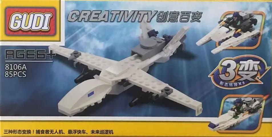 Bộ lắp ghép GUDI 8106A có tổng cộng 85 mảnh ghép và cho phép bé lắp ráp thành 3 mô hình khác nhau: máy bay không người lái, xe tốc độ và tàu tuần tra tương lai.