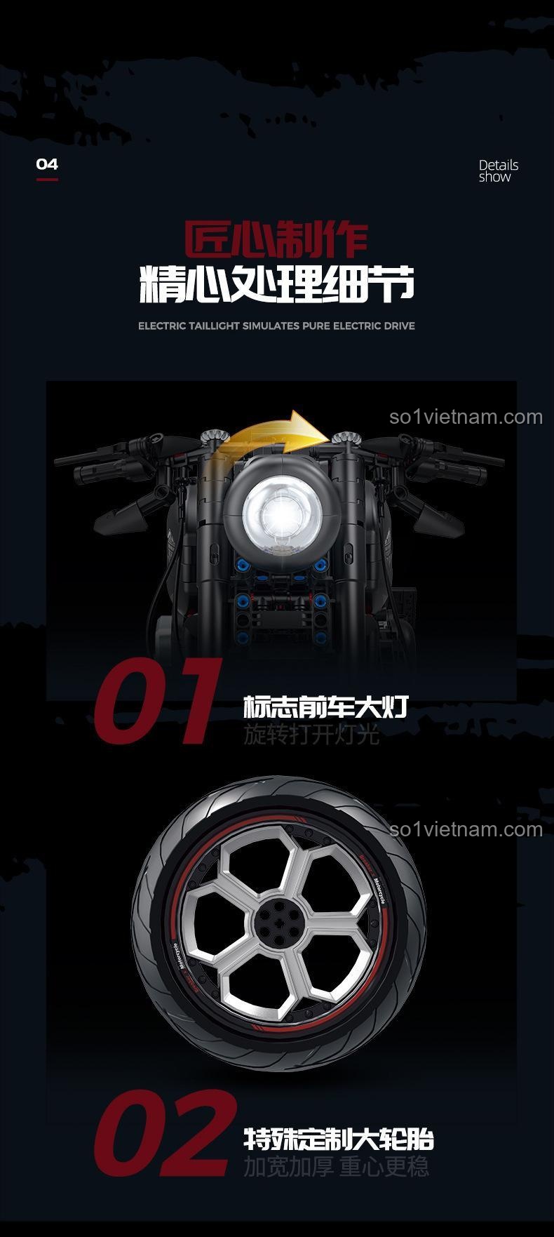 - Bánh xe lớn, lốp dày: Tái hiện chân thực vẻ ngoài mạnh mẽ và khả năng vận hành của mô tô thực tế.