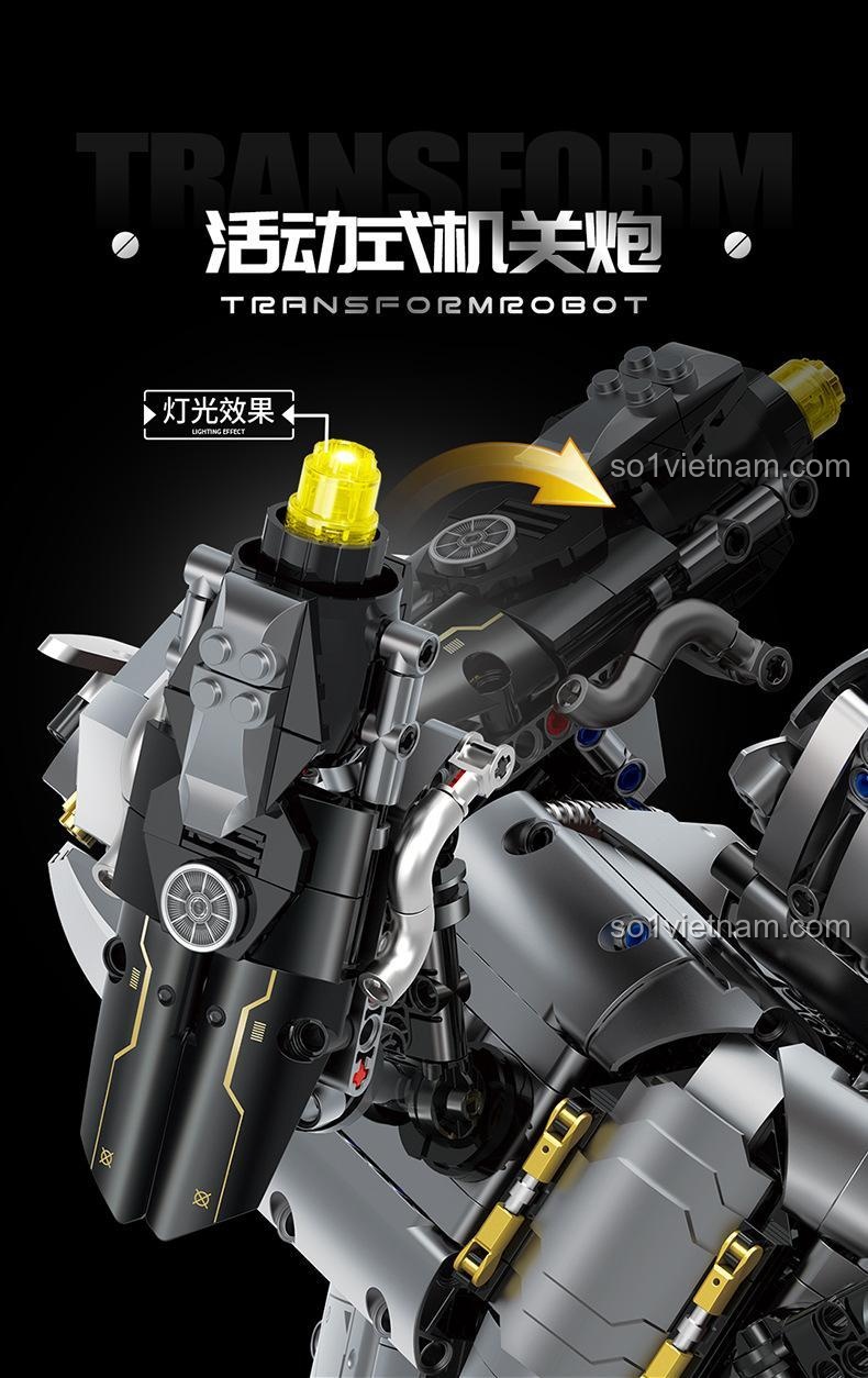 Điểm hấp dẫn nhất của GULY 80501 chính là khả năng biến hình linh hoạt. Bé có thể dễ dàng chuyển đổi mô hình từ dạng robot khủng long mạnh mẽ sang dạng robot chiến đấu đầy uy lực, mỗi dạng đều có những nét độc đáo riêng. Khả năng này không chỉ tăng thêm sự hứng thú khi chơi mà còn giúp bé rèn luyện khả năng tư duy không gian và kỹ năng giải quyết vấn đề. Bên cạnh đó, hệ thống đèn LED tích hợp ở lõi năng lượng và đôi mắt robot sẽ mang đến những hiệu ứng ánh sáng ấn tượng, đặc biệt khi chơi trong điều kiện thiếu sáng, tạo cảm giác chân thực và sống động như một robot thực thụ. Các vũ khí đi kèm cũng có thể tháo rời và lắp vào các vị trí khác nhau trên robot, cho phép bé tùy chỉnh và sáng tạo.