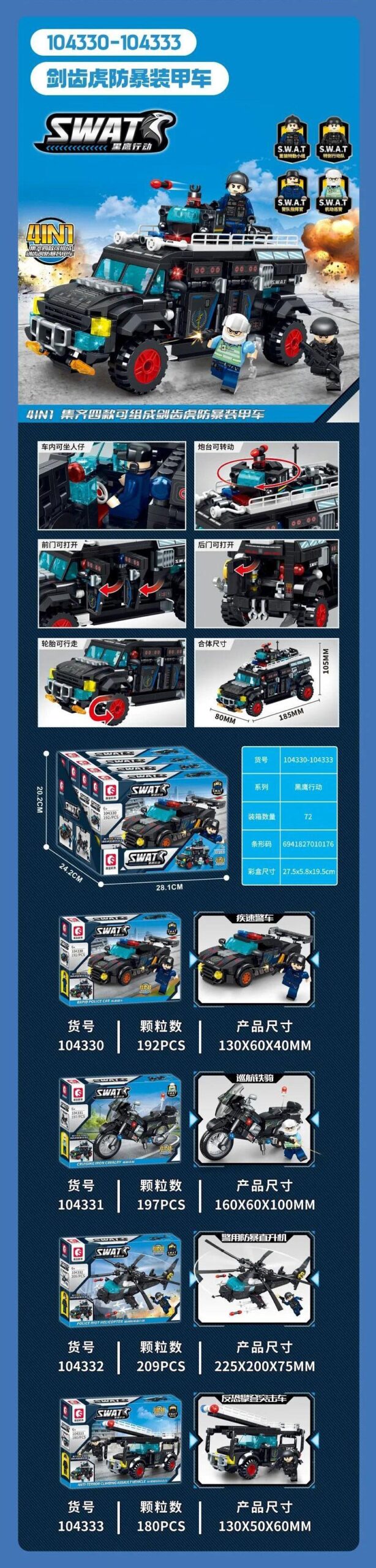 Bộ đồ chơi lắp ráp Xe Bọc Thép SWAT SEMBO 104330-104333 gây ấn tượng mạnh mẽ ngay từ cái nhìn đầu tiên với thiết kế chi tiết và màu sắc chủ đạo đầy uy lực. Với tông màu đen mạnh mẽ, kết hợp cùng các điểm nhấn xanh dương, xám và đỏ, chiếc xe bọc thép Răng Kiếm hiện lên như một cỗ máy chiến đấu thực thụ, sẵn sàng đối mặt với mọi thử thách. Kích thước mô hình sau khi lắp ráp hoàn chỉnh là 18.5 cm chiều dài, 8 cm chiều rộng và 10.5 cm chiều cao, tạo nên một mô hình vừa vặn để bé dễ dàng cầm nắm và tương tác.