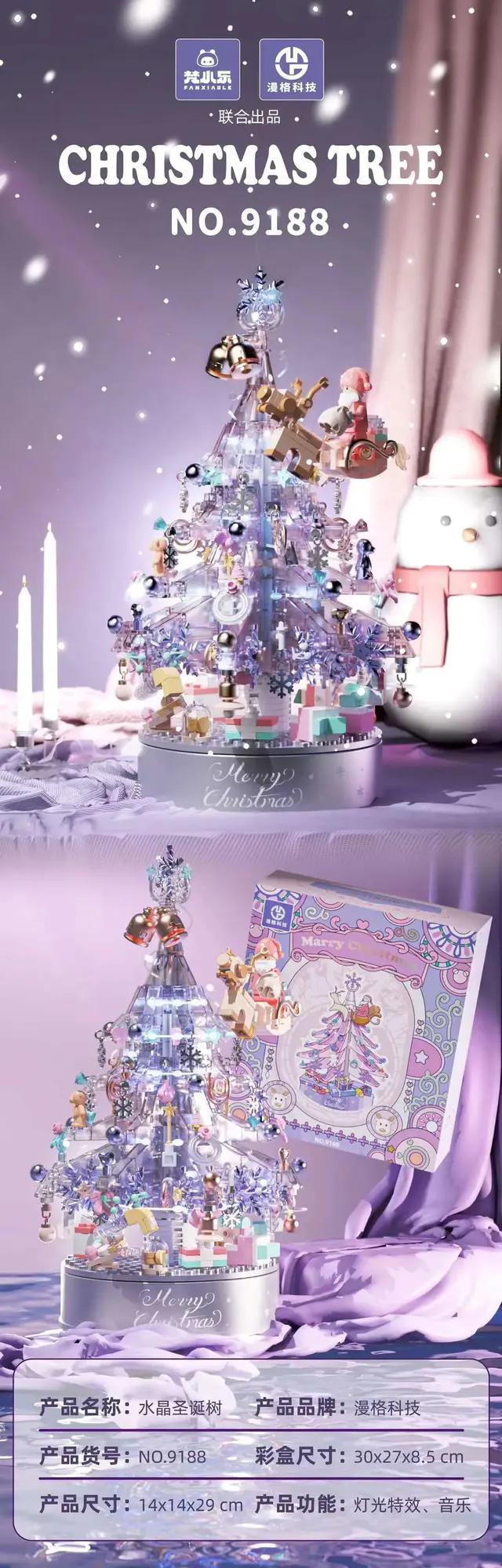 Bộ lắp ghép MENGGE TECHNOLOGY 9188 nổi bật với thiết kế cây thông Noel bằng pha lê trong suốt, tích hợp hộp nhạc phát giai điệu Giáng Sinh và hệ thống đèn LED lung linh, tạo hiệu ứng ánh sáng huyền ảo.