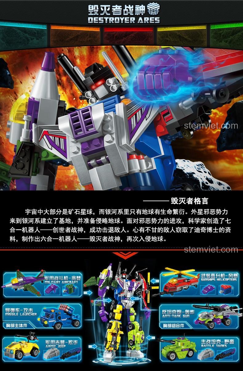 Đối mặt với hiểm nguy, các nhà khoa học vĩ đại đã tạo ra Chiến thần Sáng thế – một robot bảy trong một mạnh mẽ, thành công đẩy lùi kẻ thù. Tuy nhiên, lòng tham và sự đố kỵ đã khiến kẻ thù đánh cắp dữ liệu của Tiến sĩ Diki, tạo ra một đối thủ đáng gờm không kém: Robot Biến Hình 6 trong 1 QMAN – Chiến thần Hủy diệt Ares. Cuộc chiến giữa thiện và ác lại bùng nổ, và giờ đây, bé trai của bạn sẽ là một phần của cuộc chiến vĩ đại này. Hãy để bé tự mình viết tiếp câu chuyện về những trận chiến hoành tráng, nơi trí tưởng tượng là vũ khí mạnh nhất!