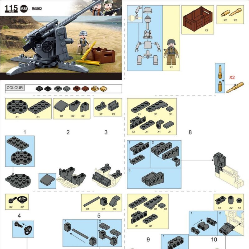 Tải ngay PDF gốc chất lượng cao: Hướng dẫn lắp ráp Pháo Chống Tăng 88MM Đức Thế Chiến II Sluban M38-B0852. Zoom chi tiết, in rõ nét. Giải pháp cho người chơi bị mất sách Sluban 0852 Pháo 88MM Thế Chiến II.